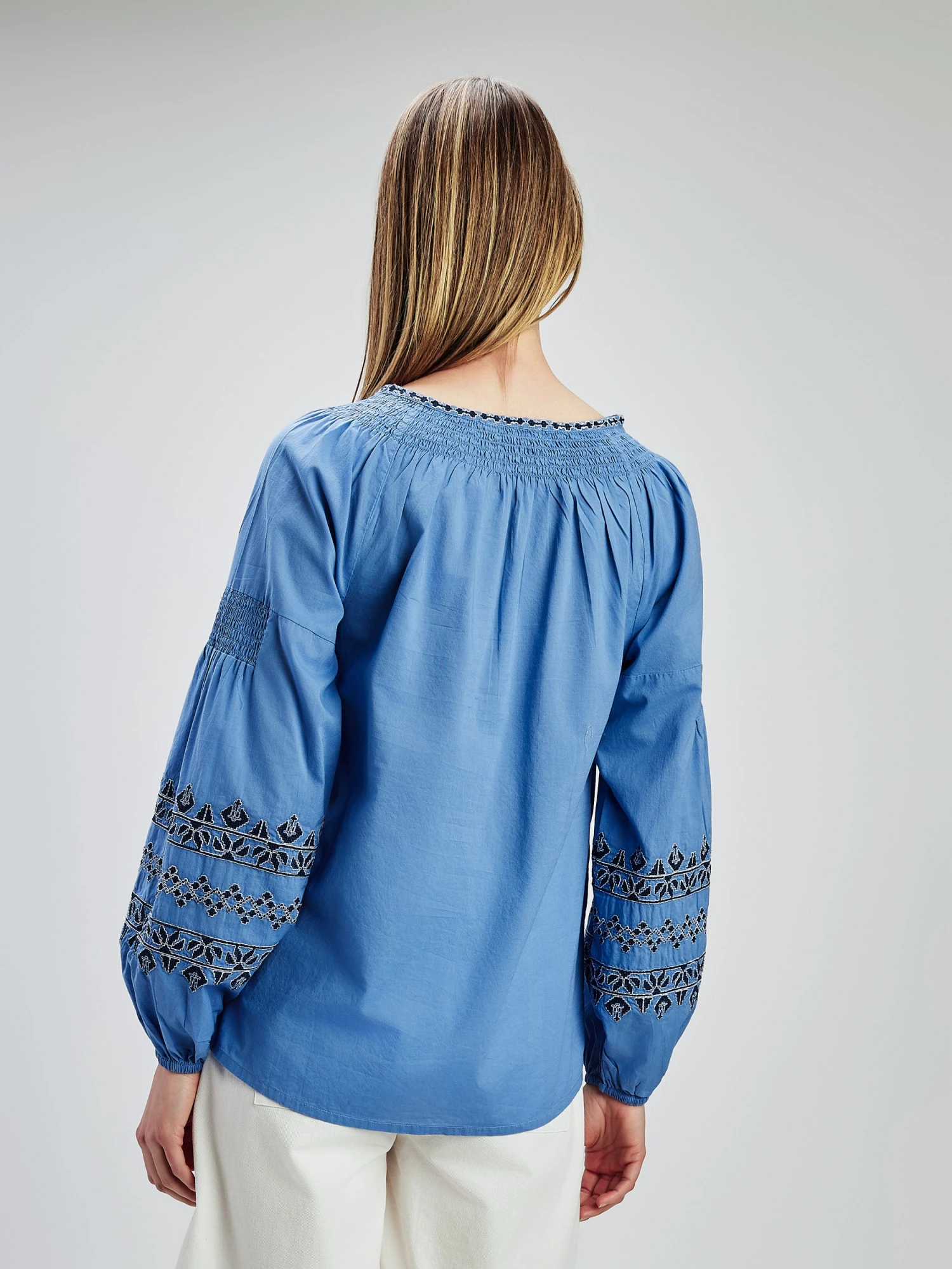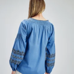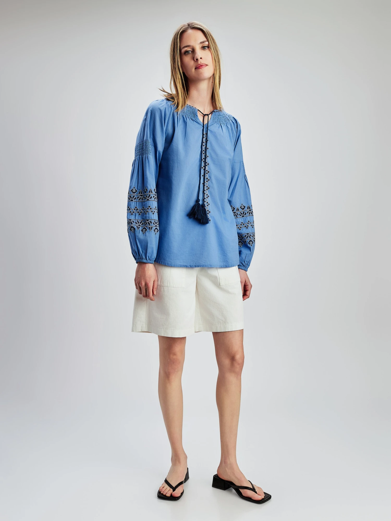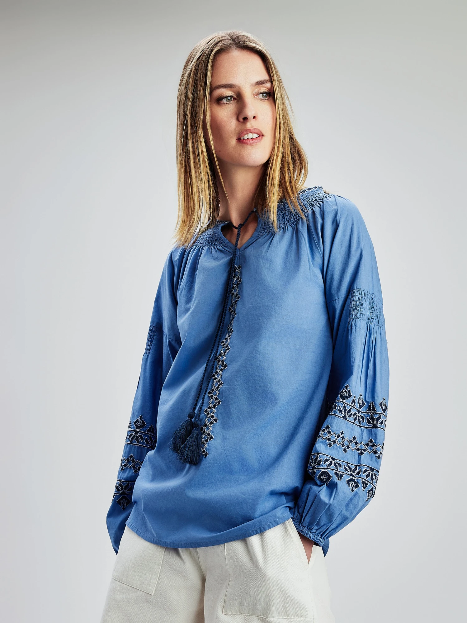 Une blouse confortable, ample et dotĂ©e d’un cordon avec houppe Ă l’encolure. Les accents de smock et de broderie lui confĂšrent un look bohĂšme.