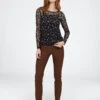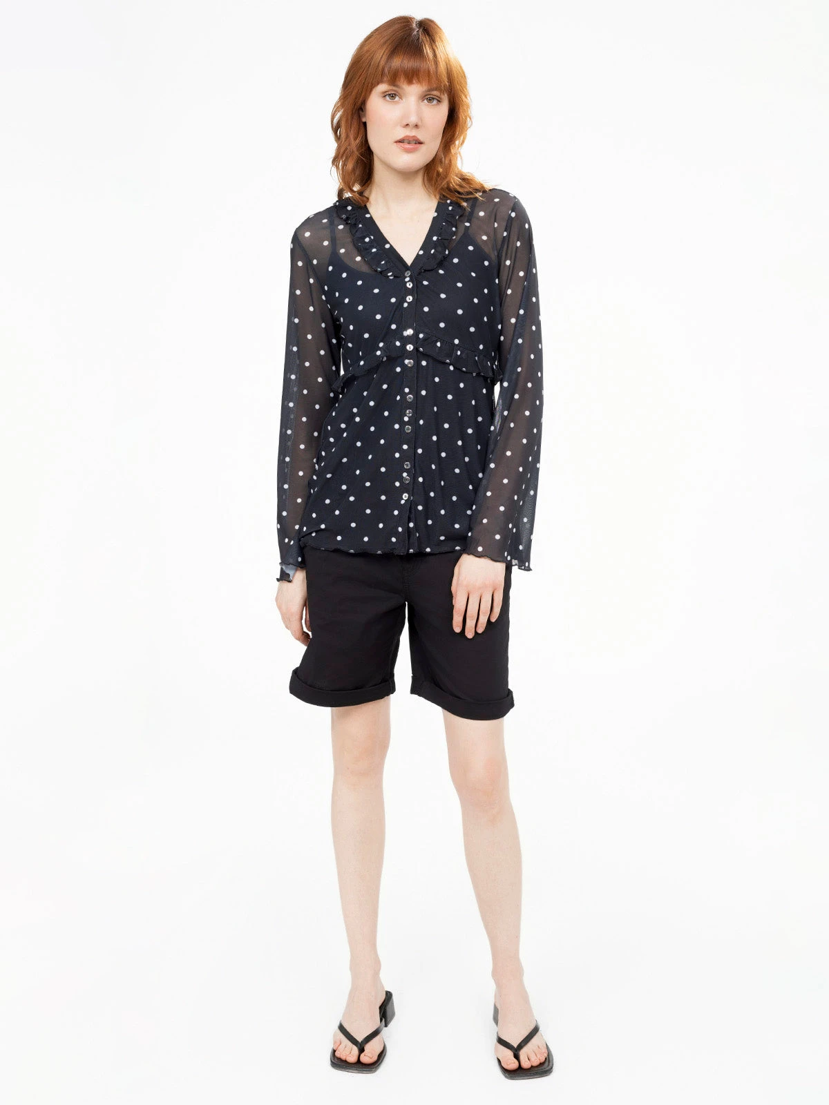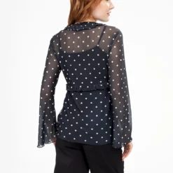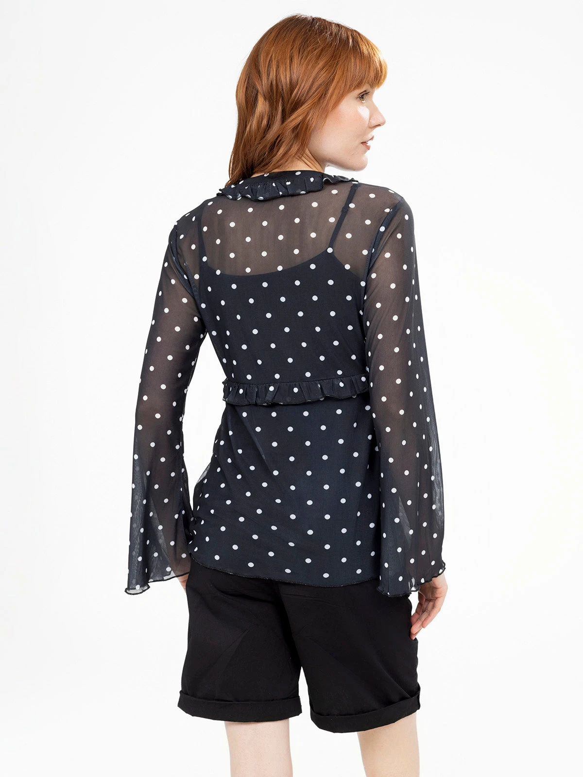 Tissu légèrement transparent à imprimé pois, manches longues évasées et bande froncée en travers du buste. Col V orné d’un volant piqué sur biais.