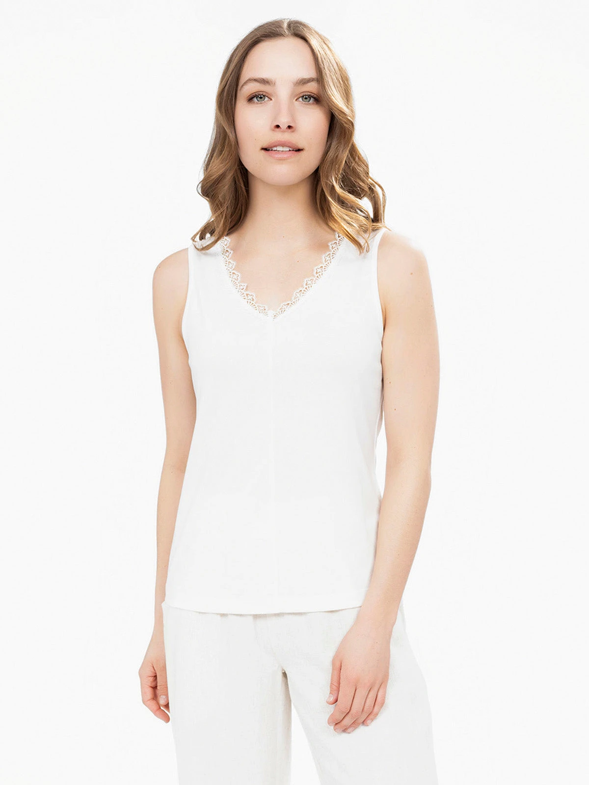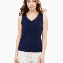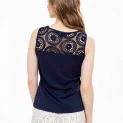Camisole en jersey extensible à encolure en V ornée de dentelle et empiÚcement en crochet floral au dos. Coupe ajustée sans manches avec couture verticale devant.