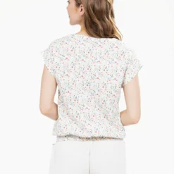 Camisole fluide Ă imprimĂ© floral dispersĂ©, dotĂ©e dâun col fendu Ă dĂ©coupe arrondie et de manches Ă revers cousus. La base Ă©lastiquĂ©e au dos crĂ©e un volume lĂ©gĂšrement blousant.