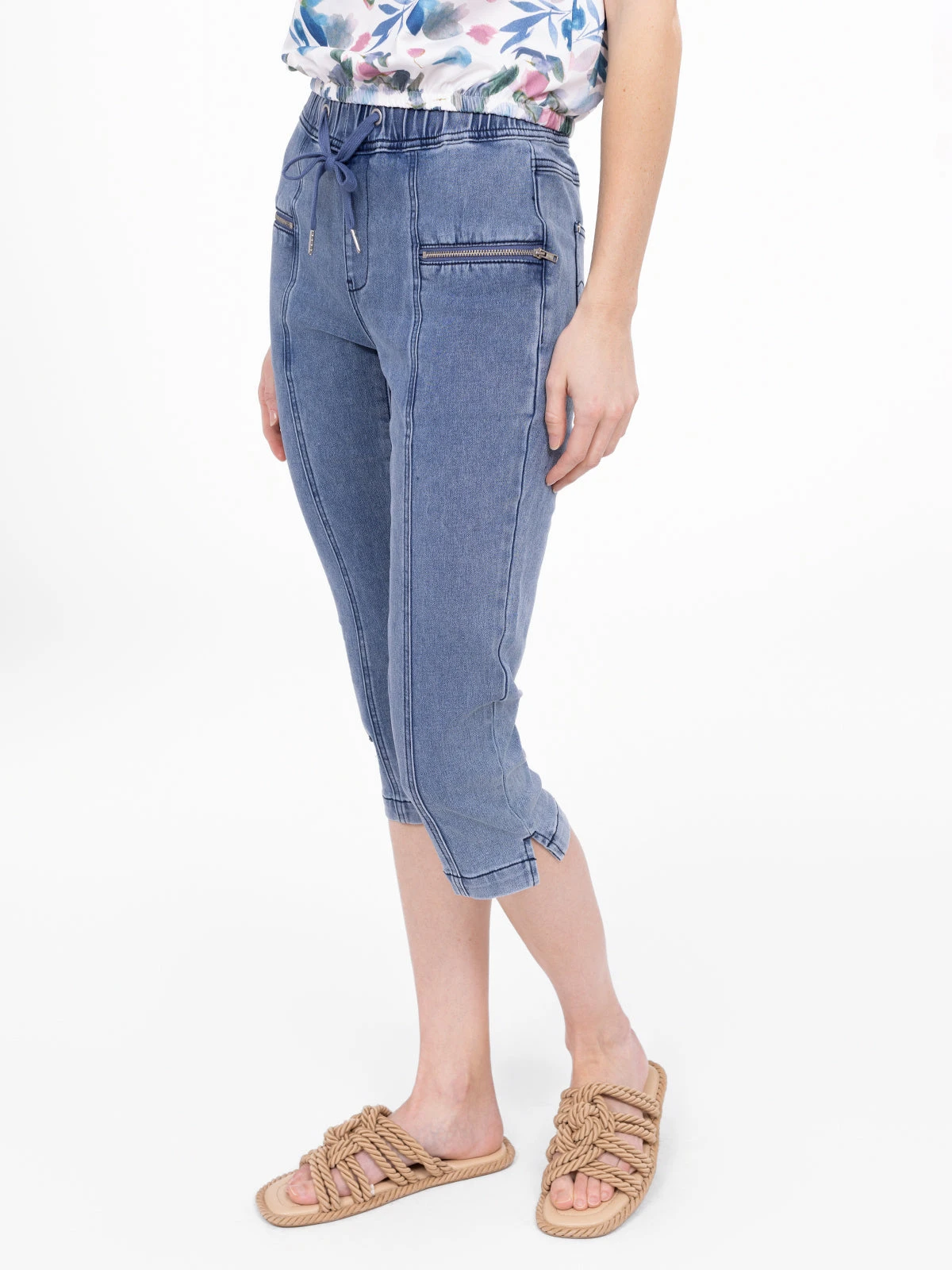 Ce capri en denim dévoile une allure décontractée avec sa coupe ajustée et ses ourlets retroussés. Son cordon de serrage ajoute une touche de praticité et de légèreté.
