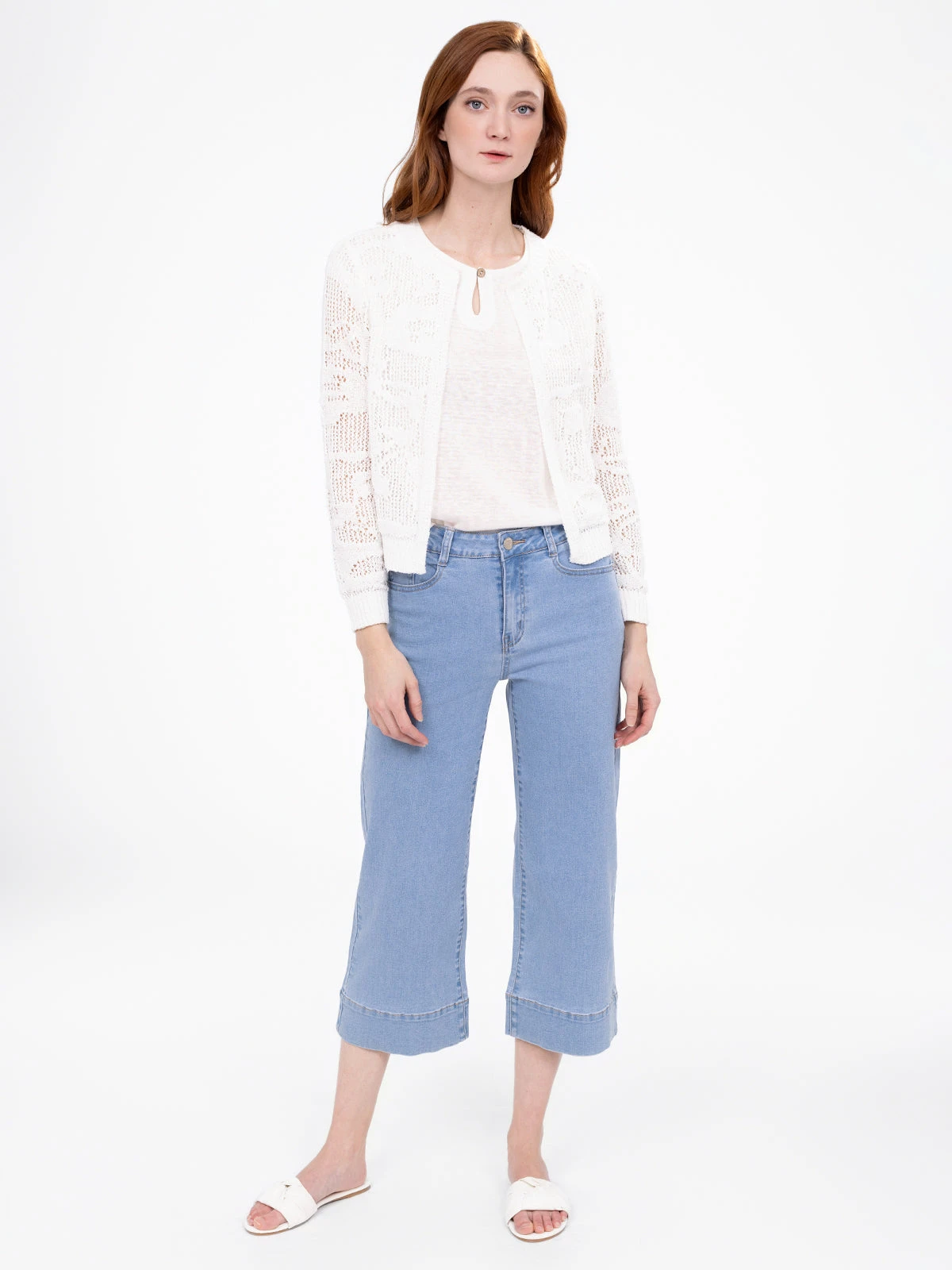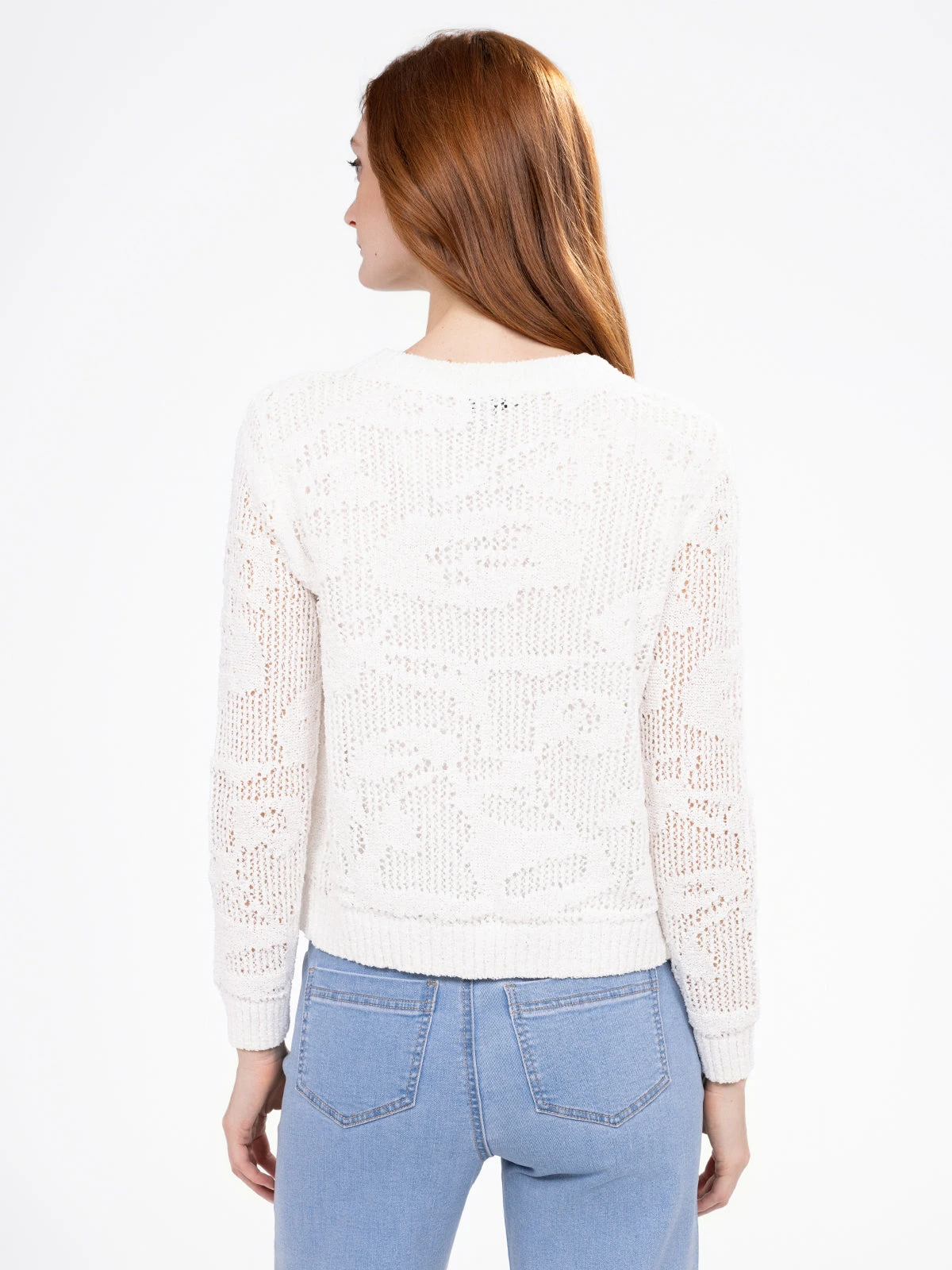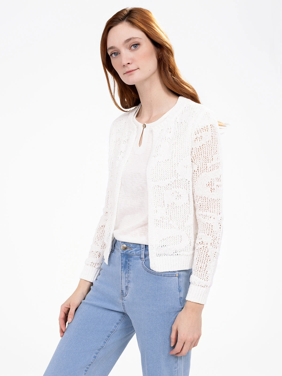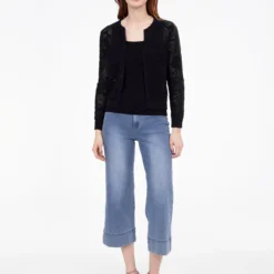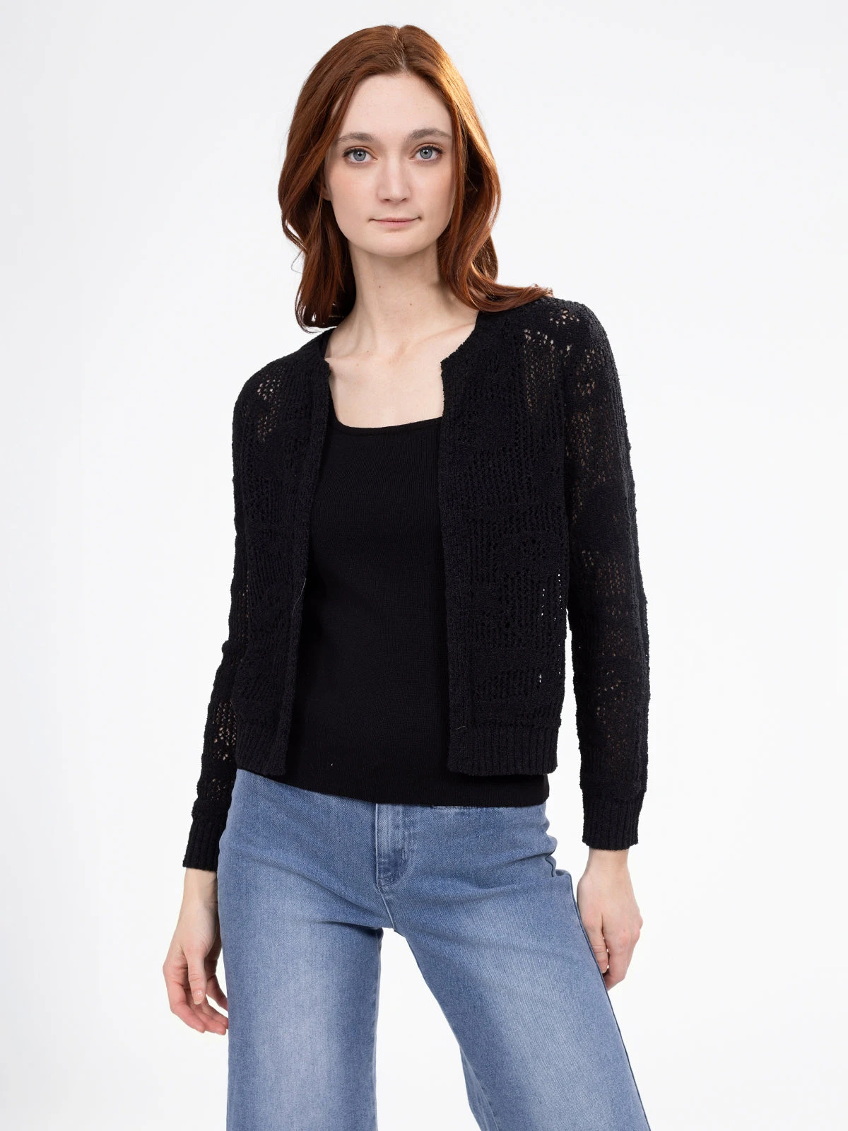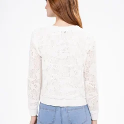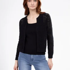Travaillé dans une maille légère et aérée, ce cardigan séduit par ses motifs en relief et sa coupe courte. Ses finitions côtelées aux poignets et à la base apportent du contraste et de la tenue.