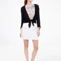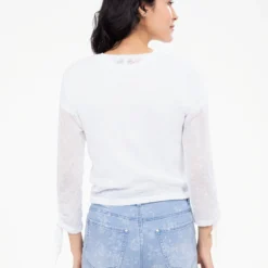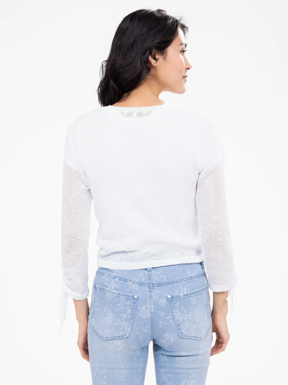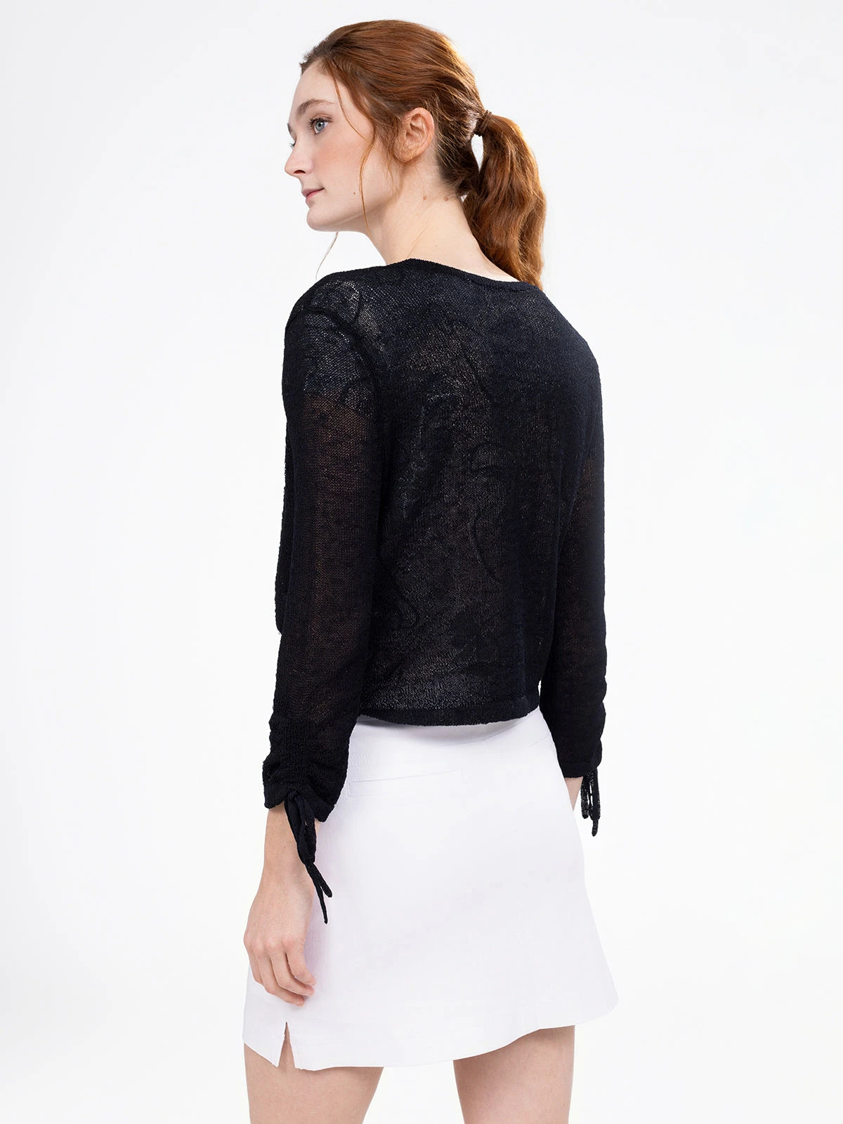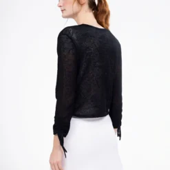 Un jeu de transparence et de texture donne du caractère à ce gilet fluide. Les petits liens aux poignets ajoutent une touche délicate et féminine.