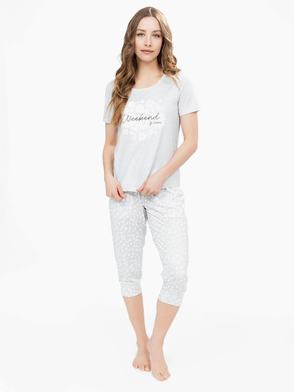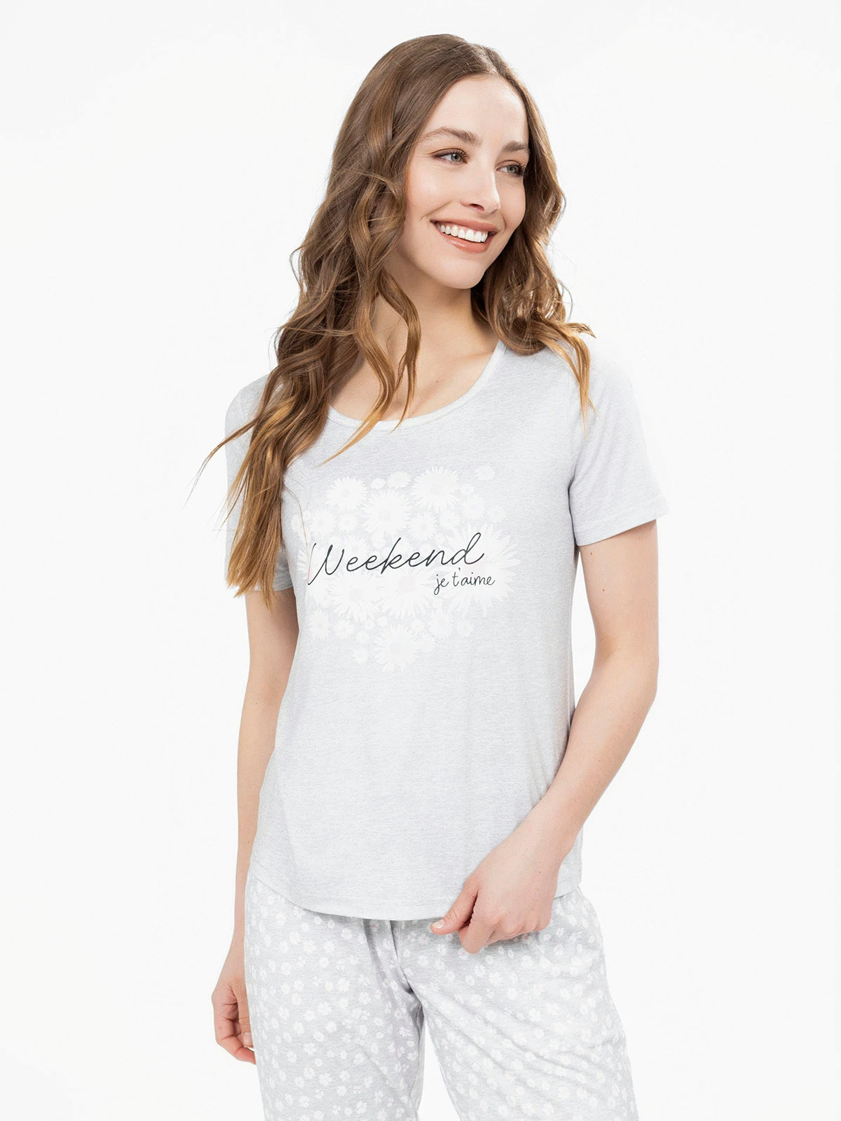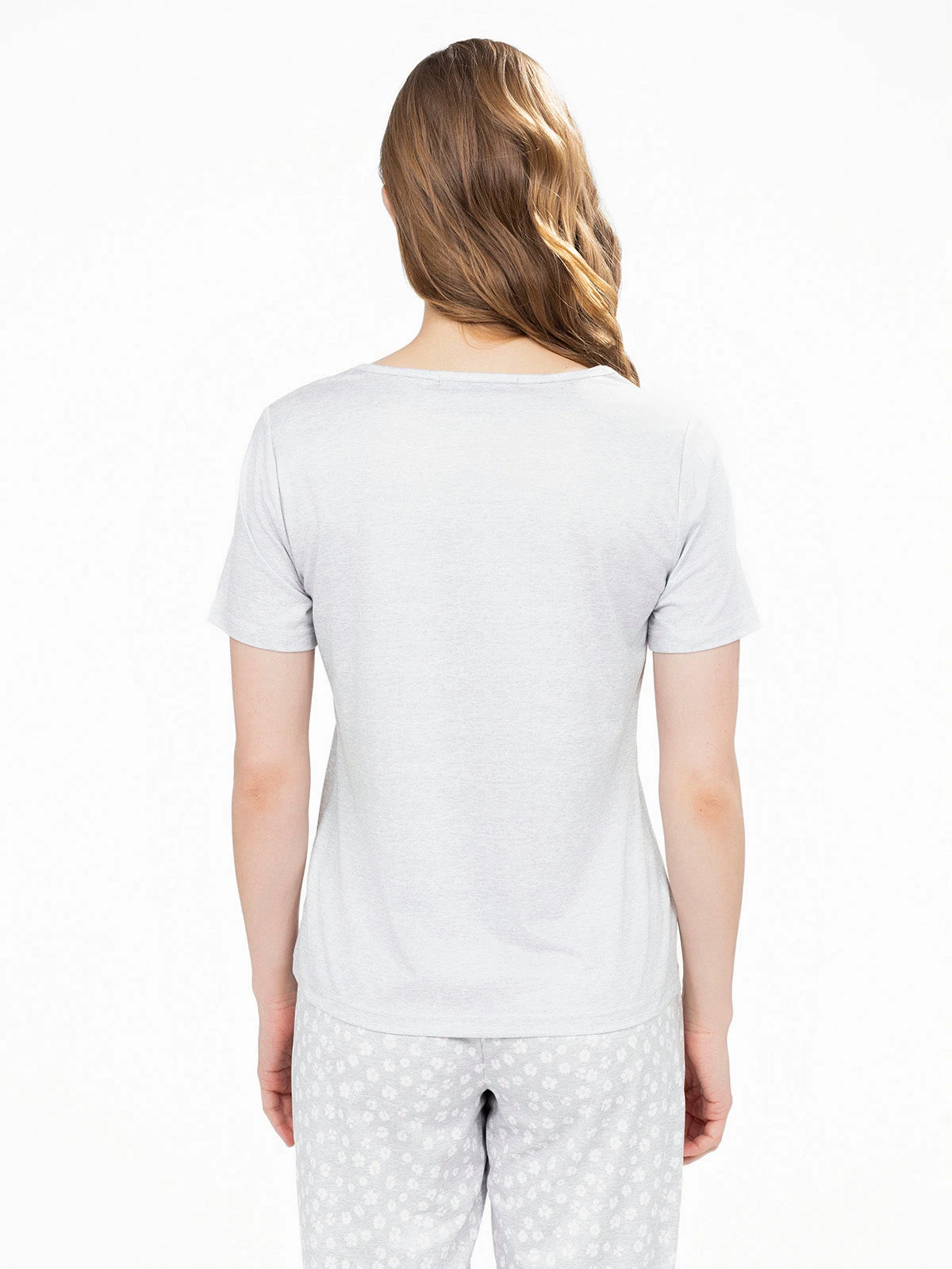 Encolure ronde dégagée, manches courtes montées et illustration florale à effet estompé avec texte imprimé sur le devant. Tissu doux et fluide légÚrement chiné, coupe semi ajustée avec finition droite au bas.