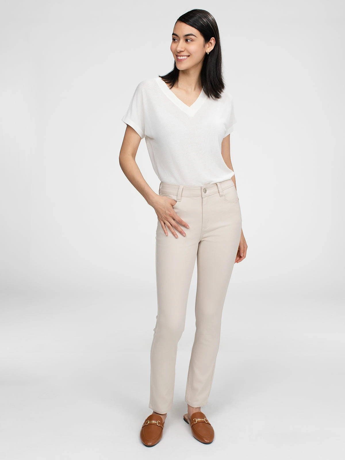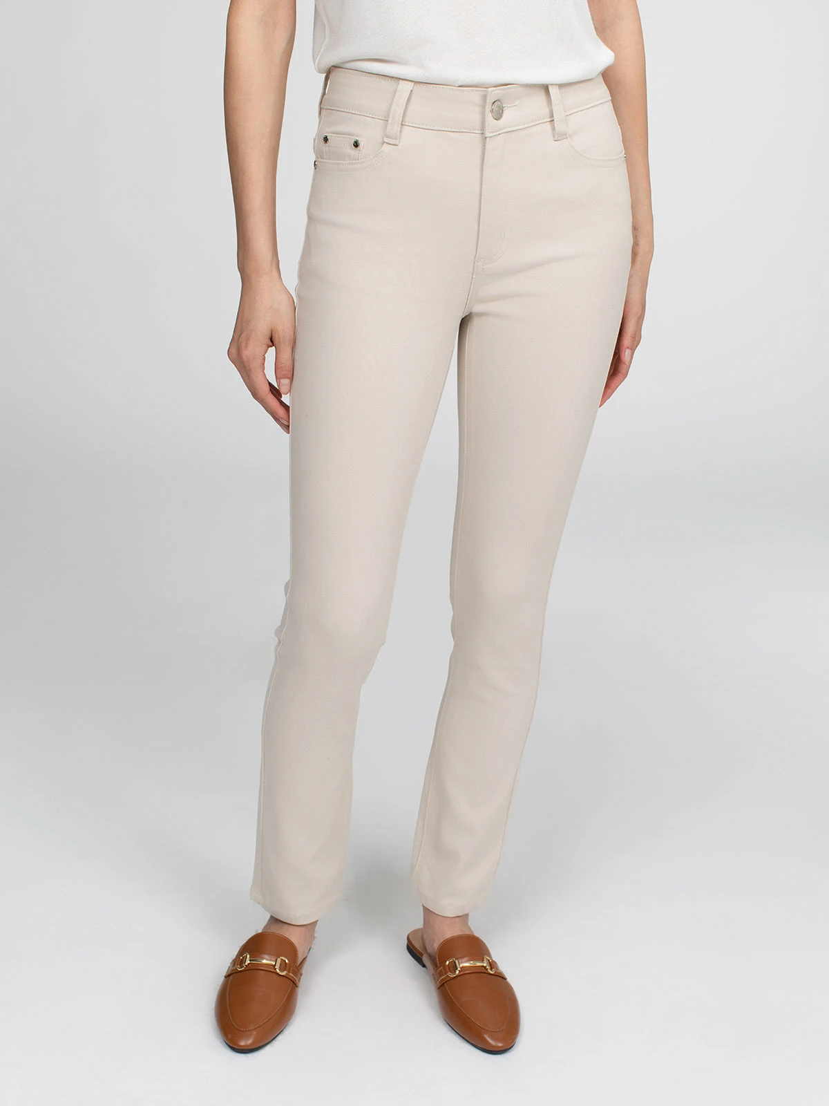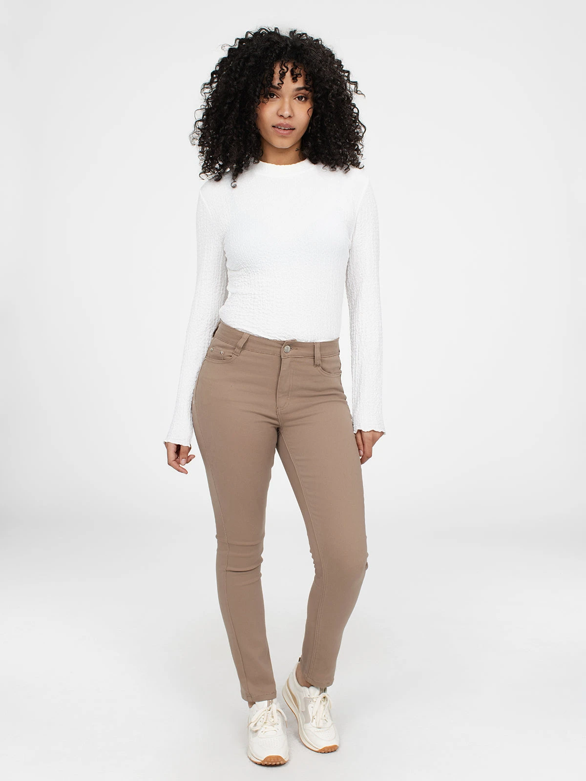 Jean en denim extensible, coupe étroite aux jambes et taille mi-haute. Finition surpiquée contrastante avec passants de ceinture et cinq poches.