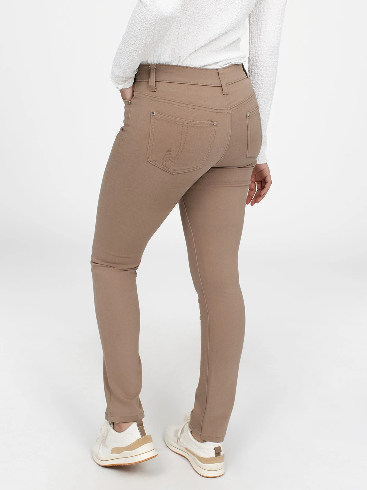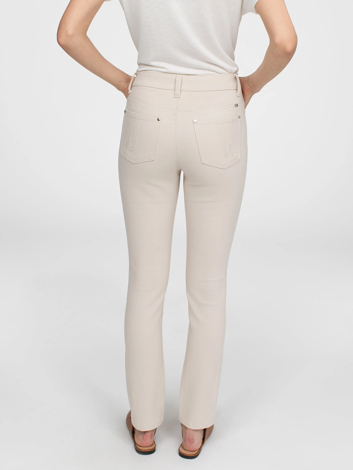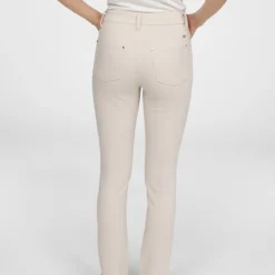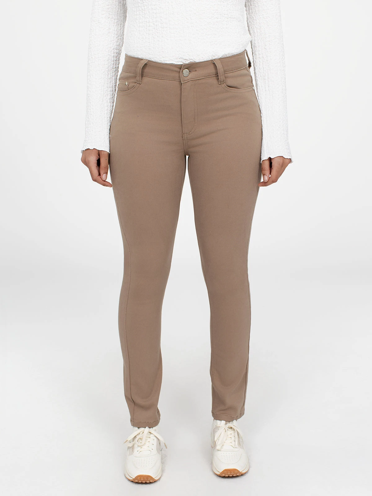Jean en denim extensible, coupe étroite aux jambes et taille mi-haute. Finition surpiquée contrastante avec passants de ceinture et cinq poches.