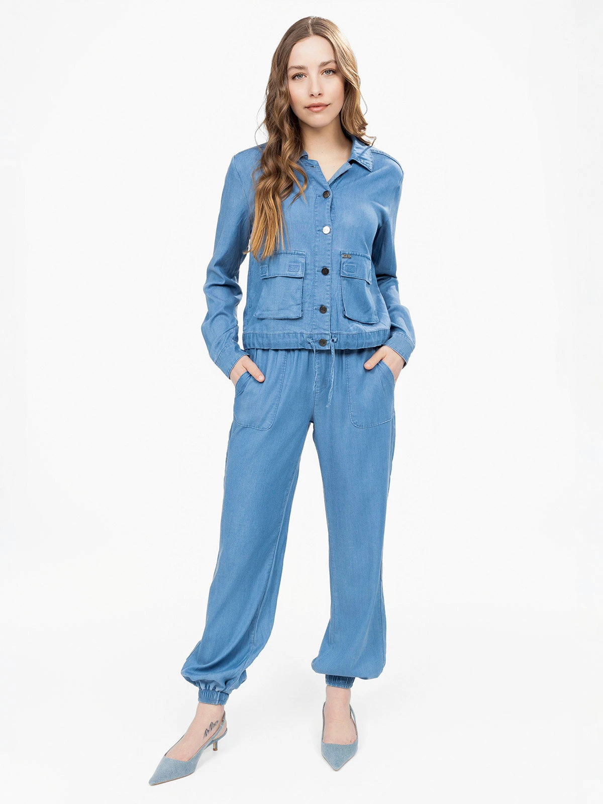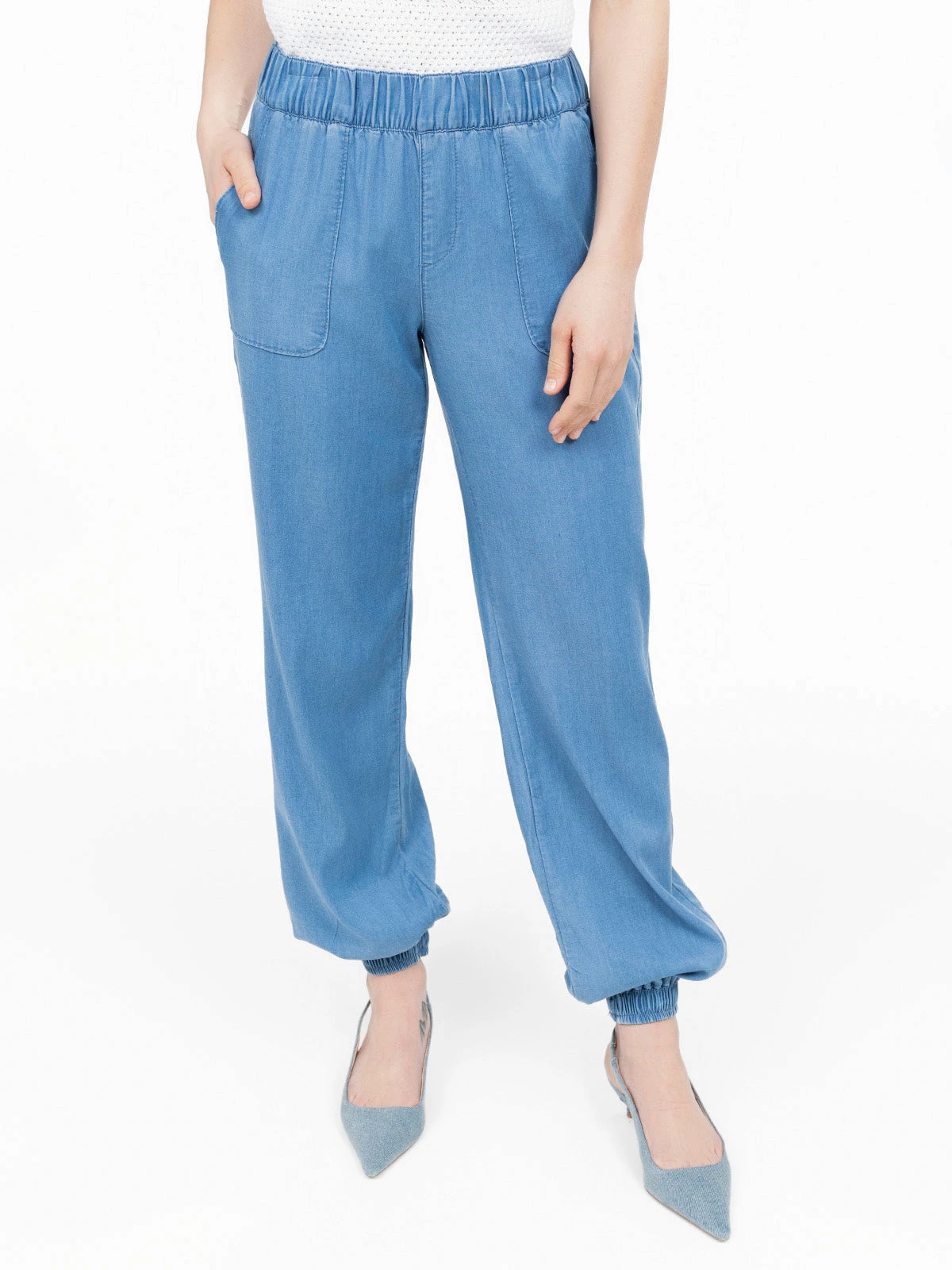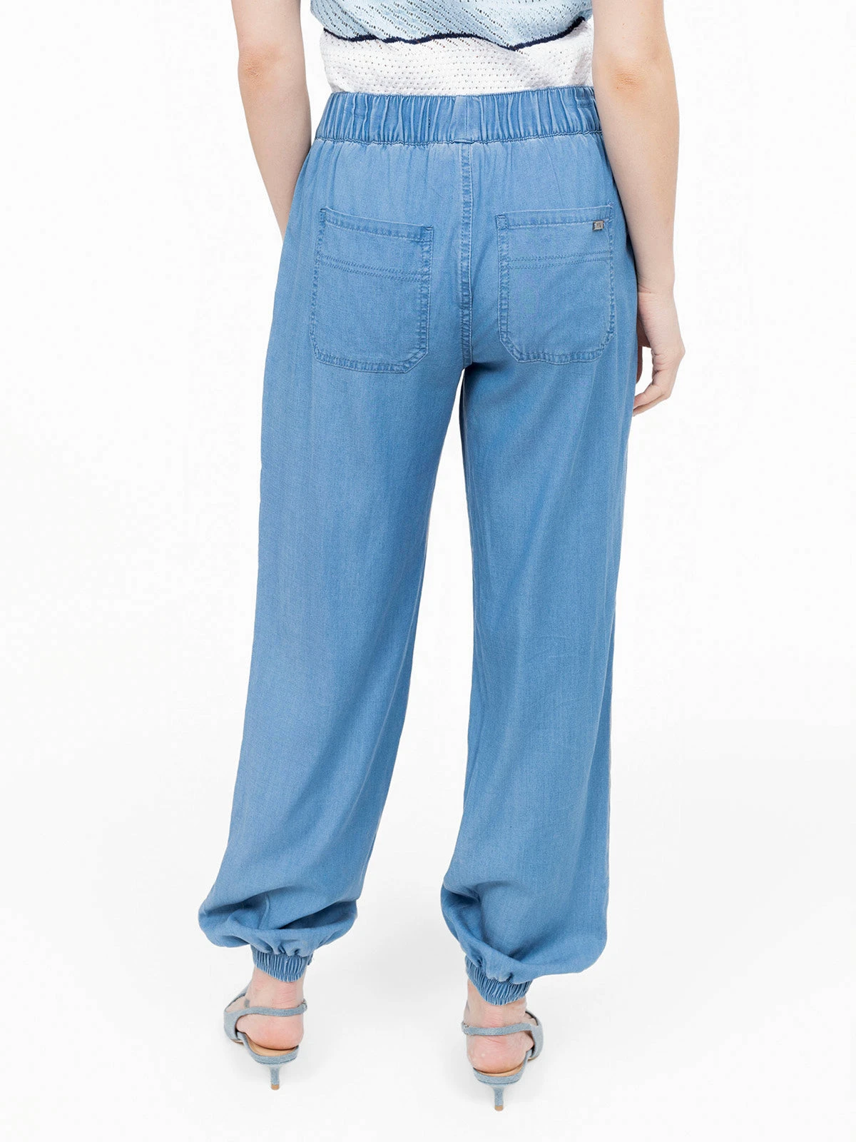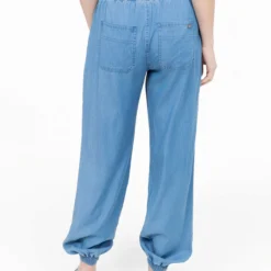 Taille élastiquée et poches plaquées à l’avant structurent ce pantalon à la coupe fluide. Le bas de jambe est resserré par un large élastique froncé.