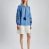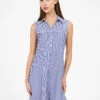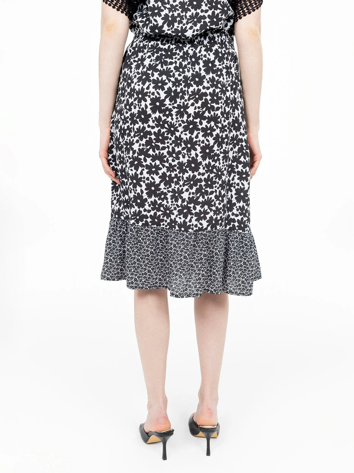 Imprimé floral contrasté sur toute la surface, rehaussé par une large bande volantée à motifs miniatures. Ceinture élastiquée avec cordon à pompons pour ajustement à la taille.