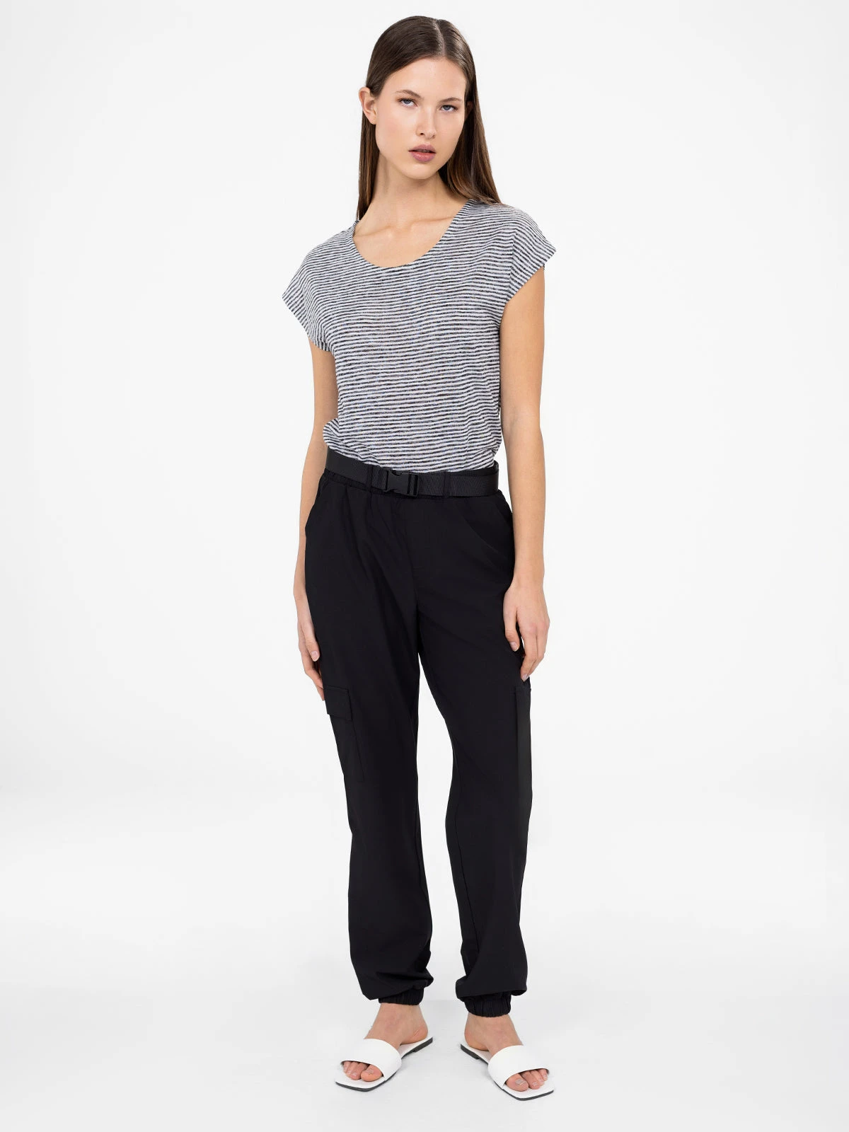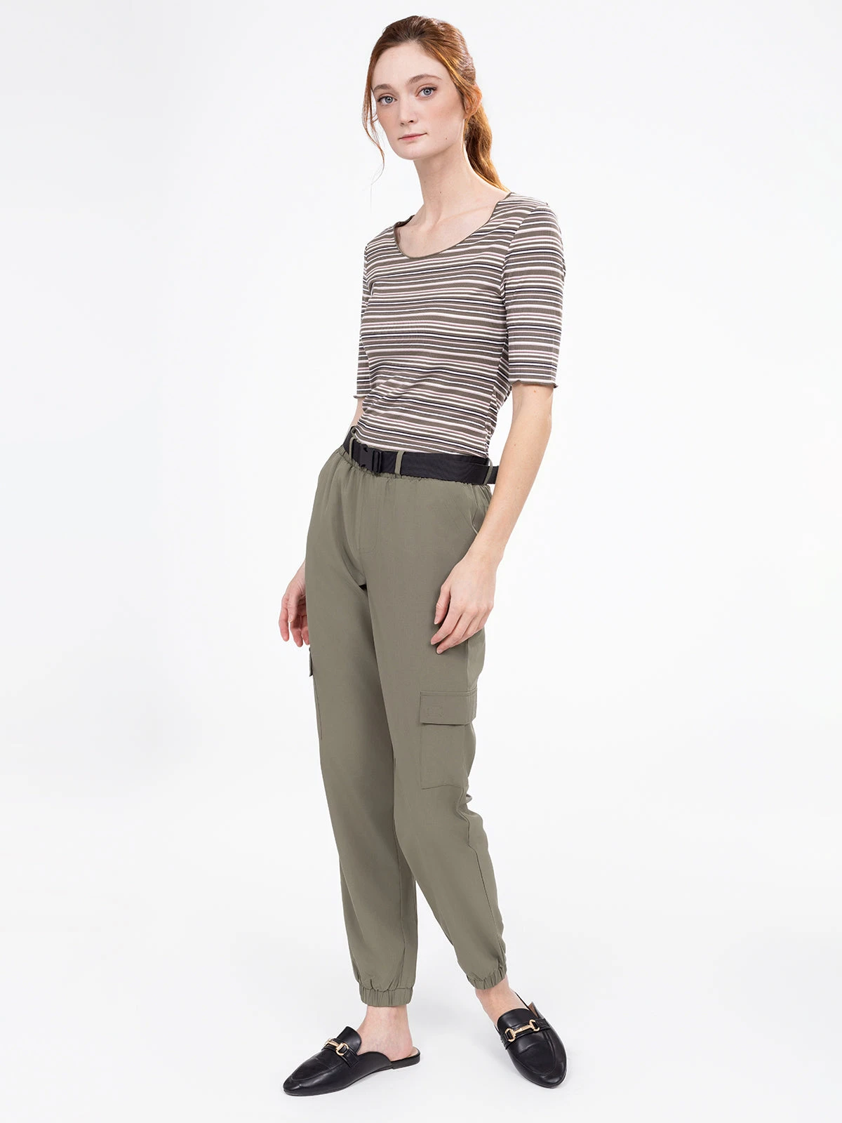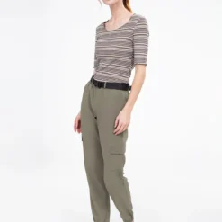 Avec ses multiples poches et sa ceinture ajustable, ce pantalon allie style et fonctionnalité. Son bas élastiqué assure une coupe flatteuse et confortable en toute occasion.