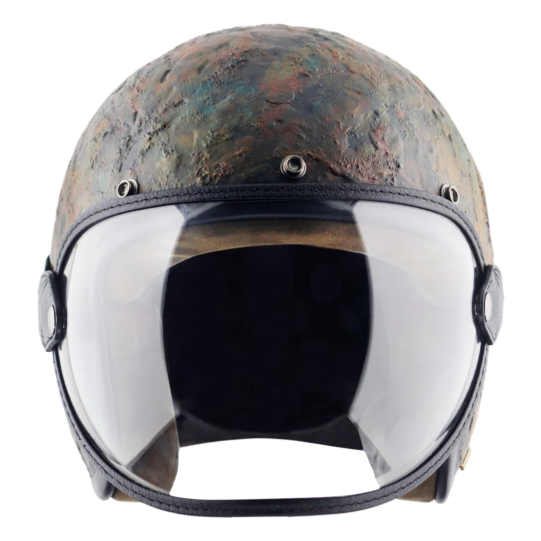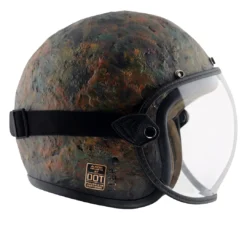 The Retro Jet Veer Helmet is a hand-sculpted design with a distinctive metal shield finish. It includes a detachable domed shield visor, antique fittings, genuine leather interiors, and is certified to both ISI and DOT standards.