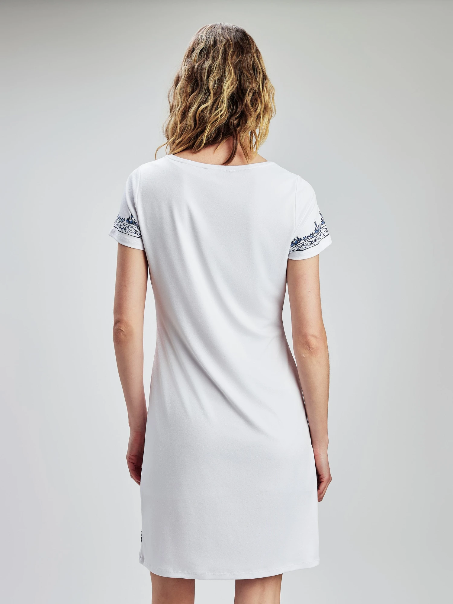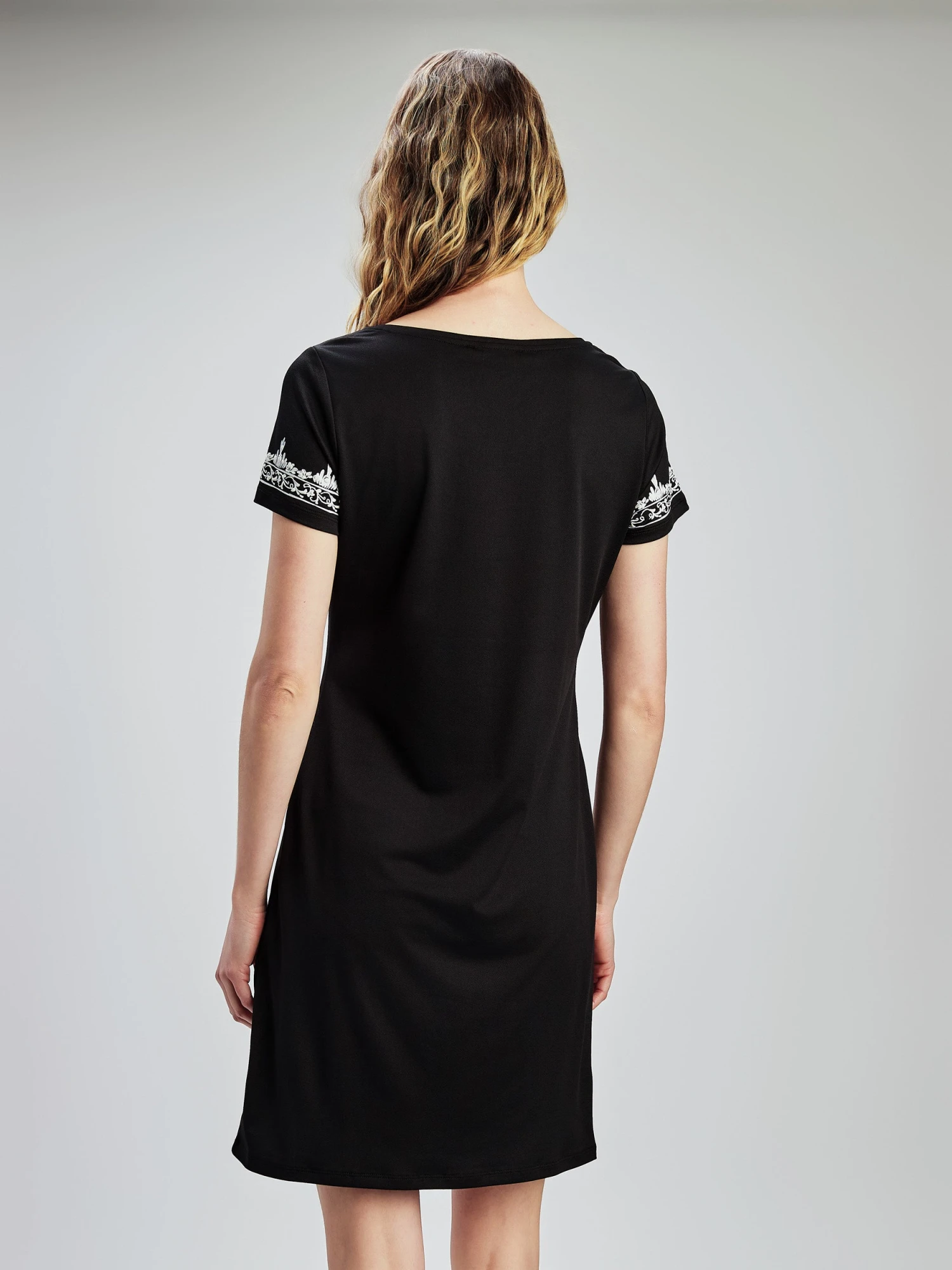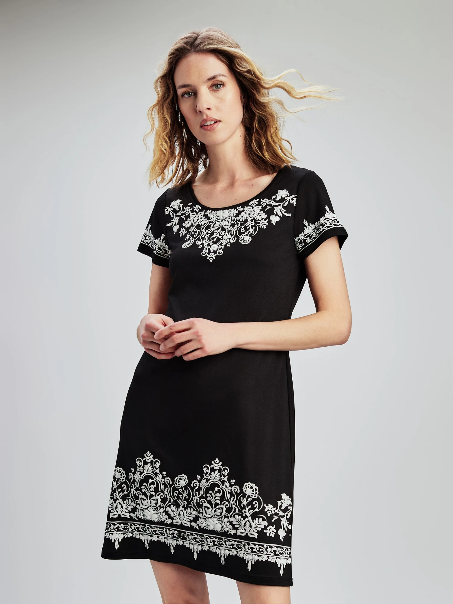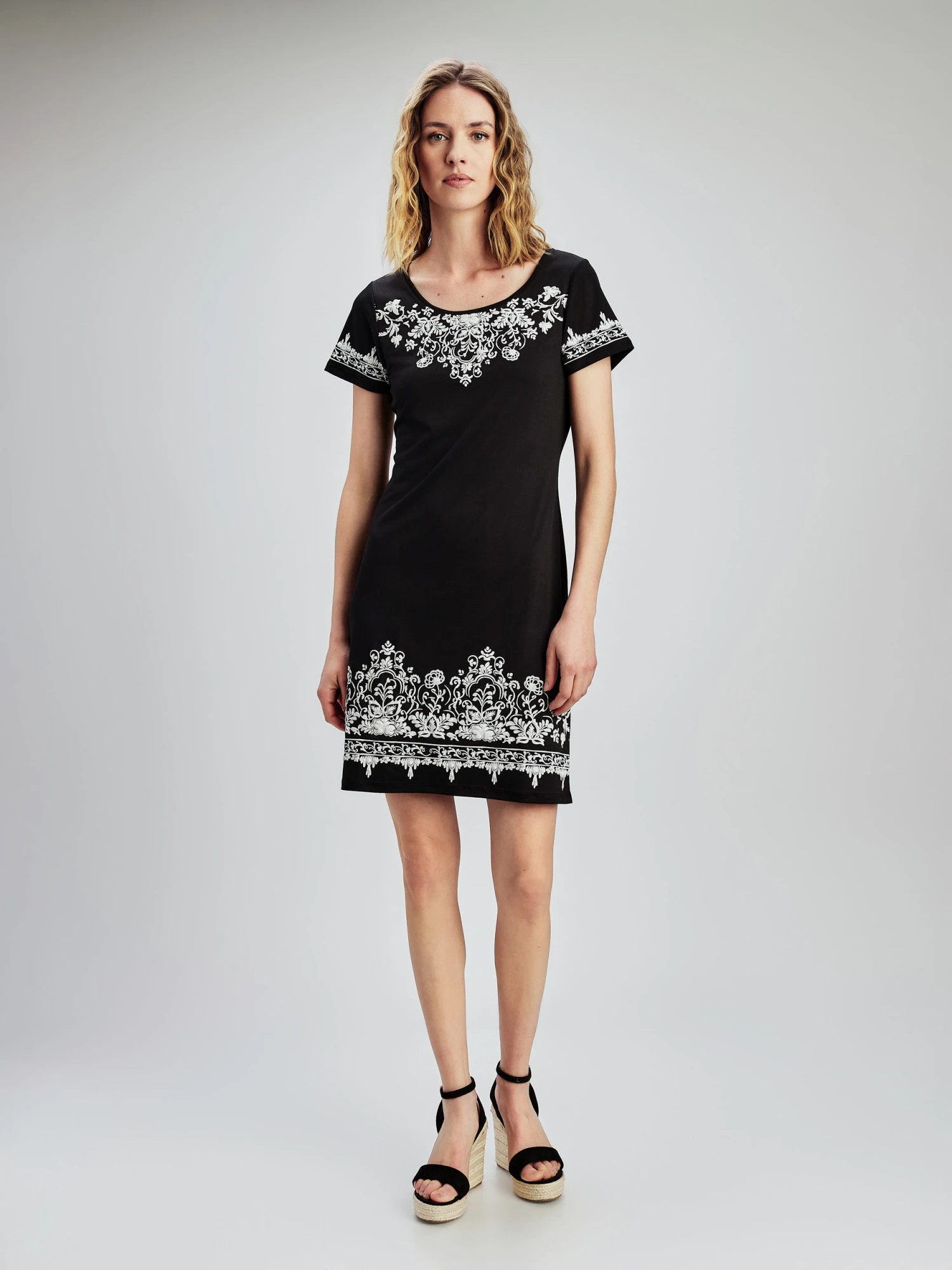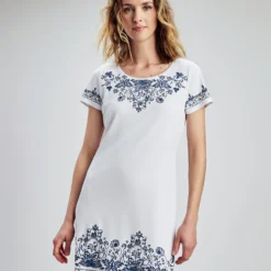 Optez pour cette robe imprimĂ©e Ă manches courtes. L’encolure ronde et la silhouette en ligne A restent simples, tandis que le motif ajoute un intĂ©rĂȘt.