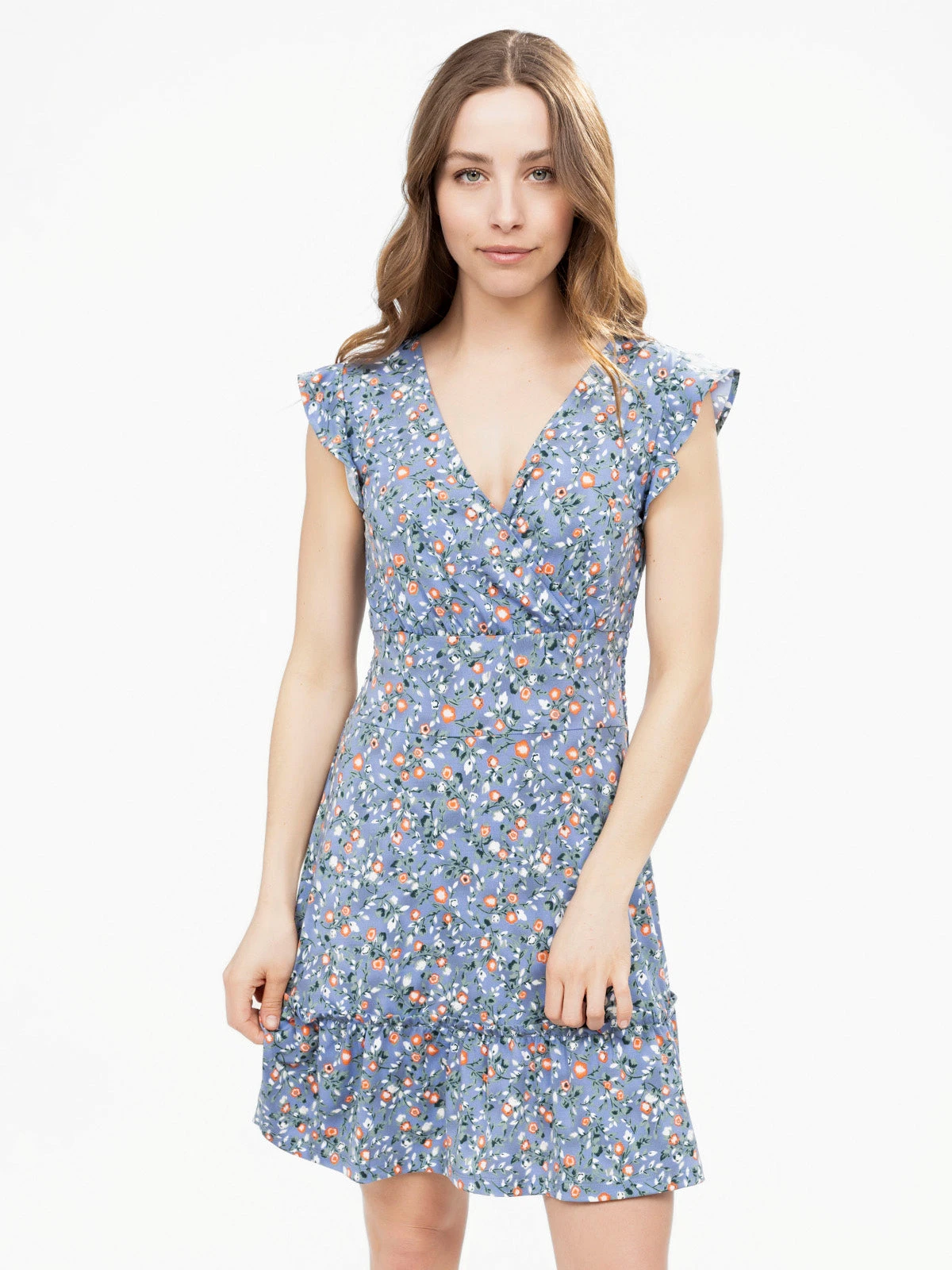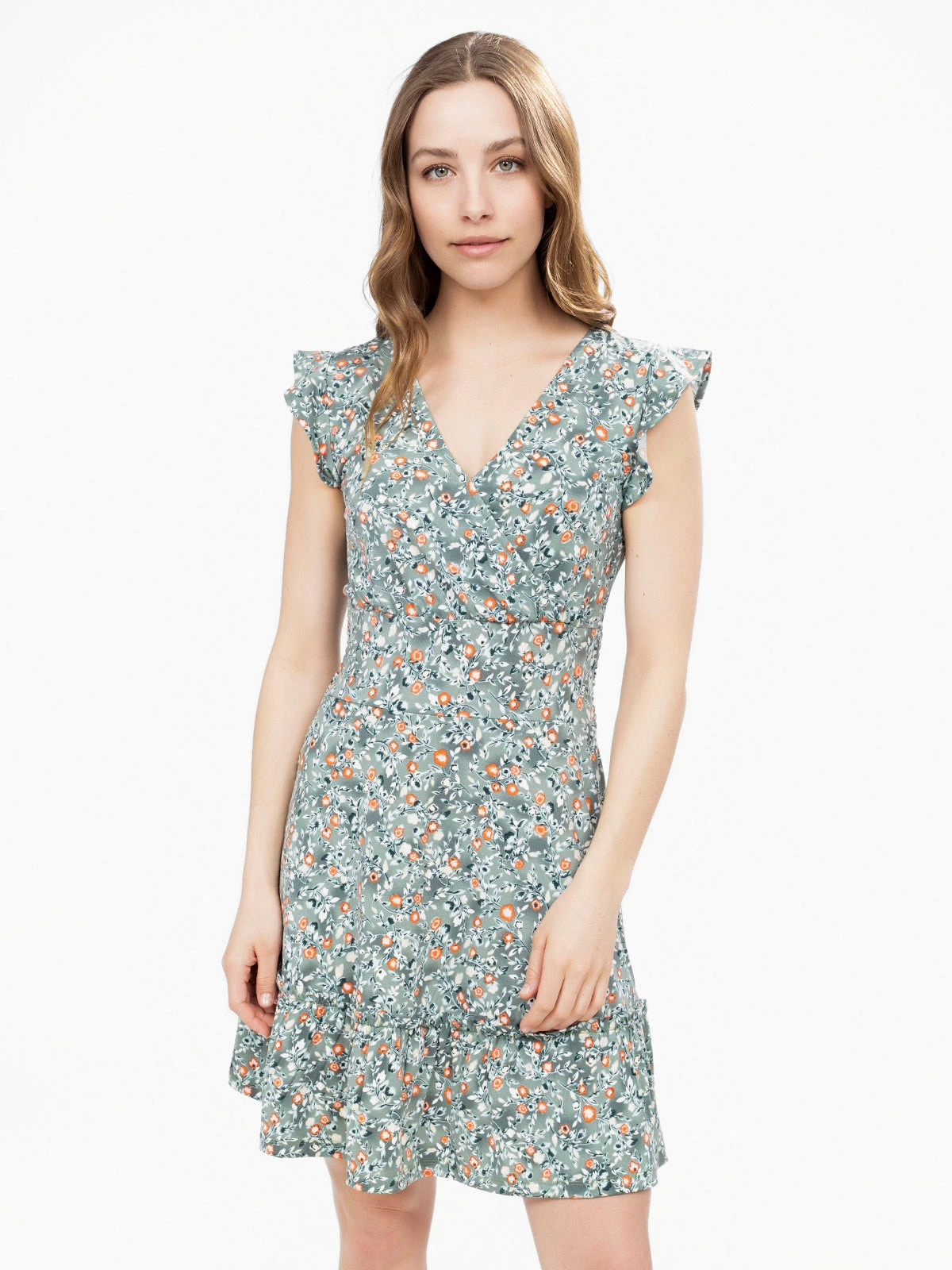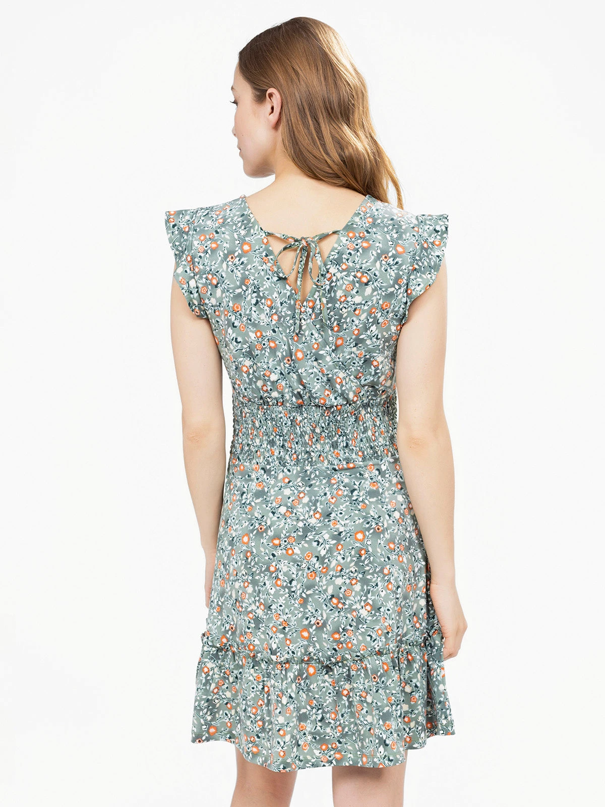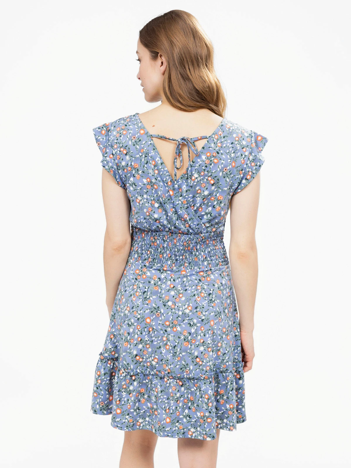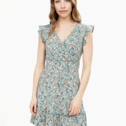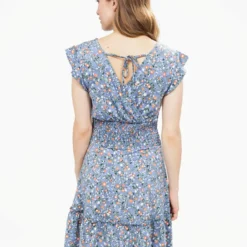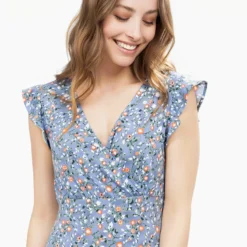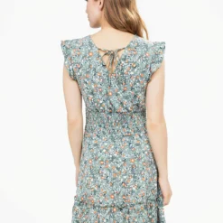 Encolure en V croisée avec effet drapé, manches courtes à volants et taille smockée au dos pour un maintien souple. Coupe évasée avec volants superposés à la base et lien à nouer dans le dos.