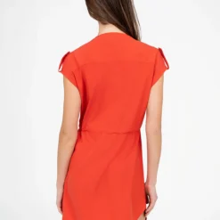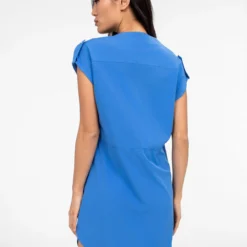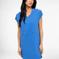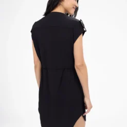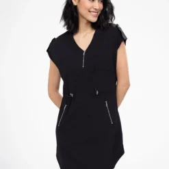 Les manches courtes à pattes boutonnées et les épaules structurées donnent une allure affirmée à cette robe. Le col zippé et les poches avant soulignent son cÎté fonctionnel, tandis que sa coupe arrondie à la base ajoute une touche fluide.