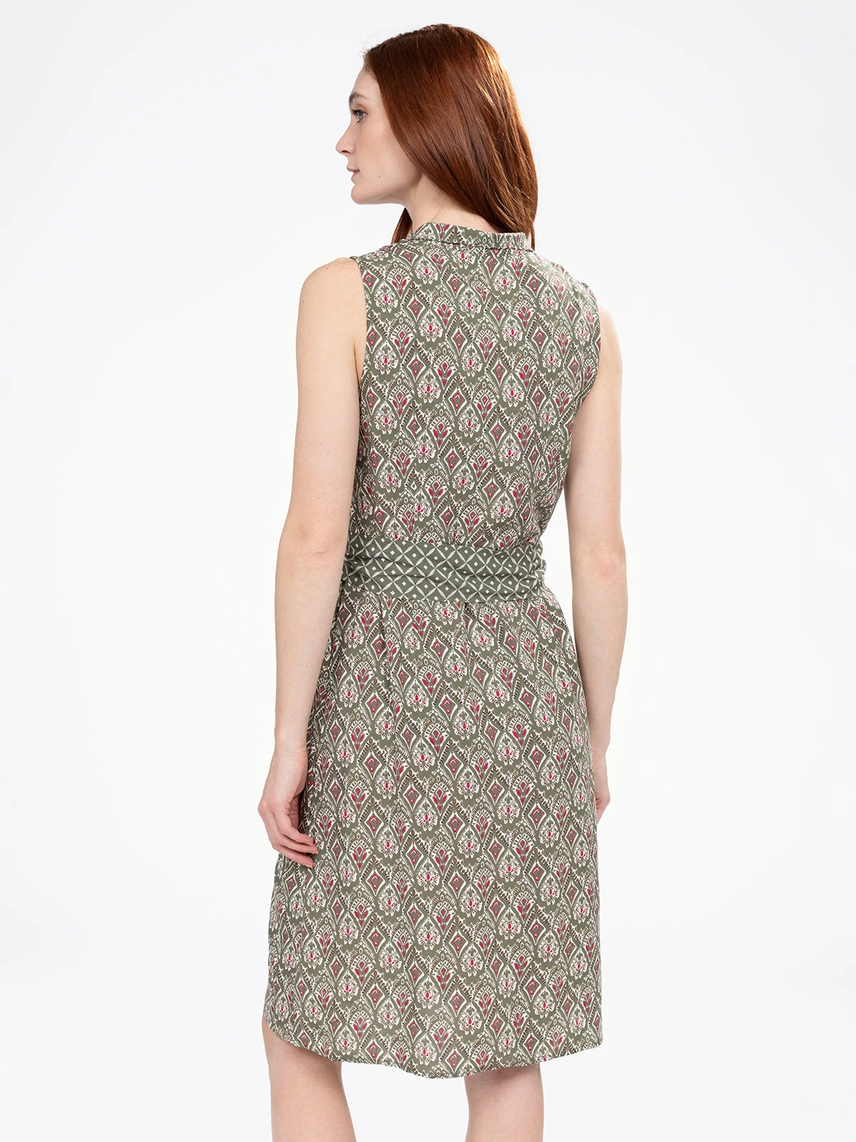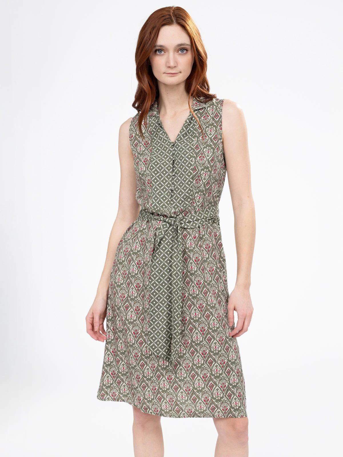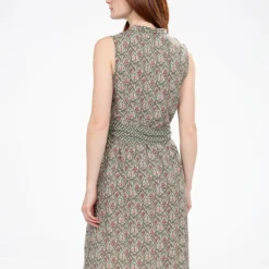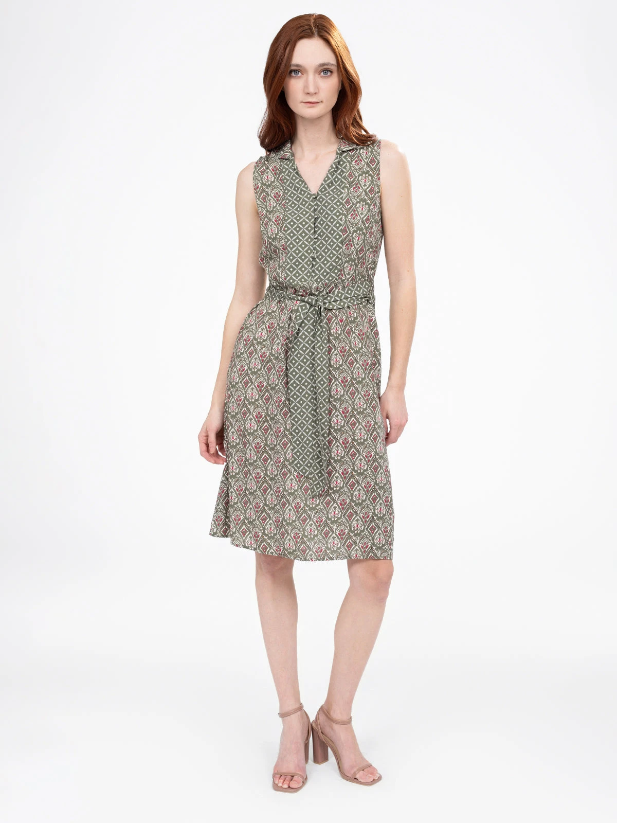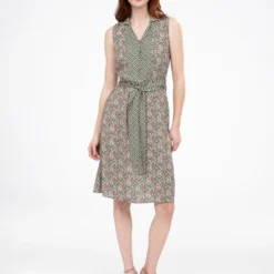 Robe sans manches Ă imprimĂ© gĂ©omĂ©trique, dotĂ©e dâun col en V et dâun lien Ă nouer Ă la taille pour une coupe ajustĂ©e. Son tissu fluide et sa longueur genou en font une piĂšce facile Ă porter.