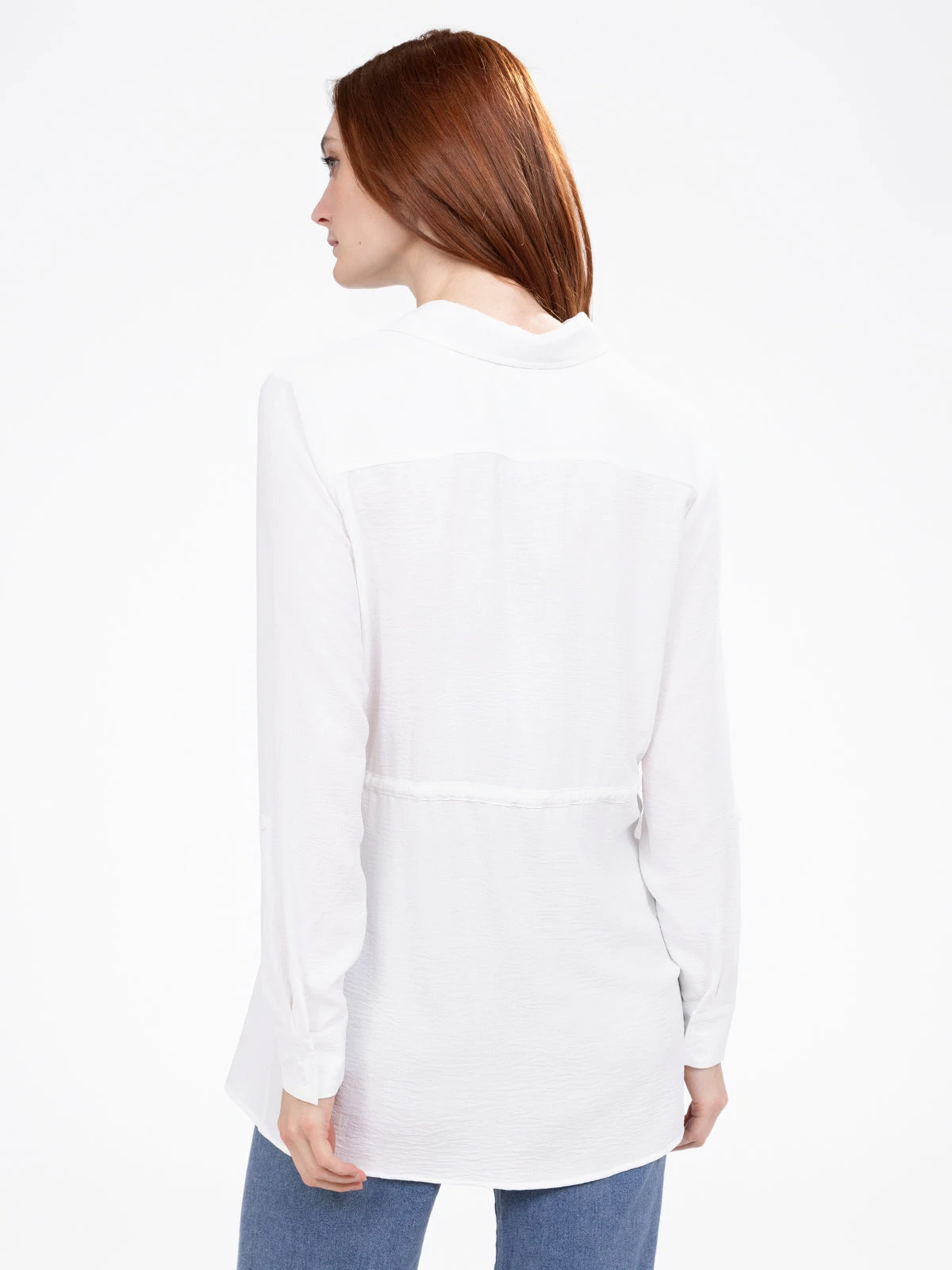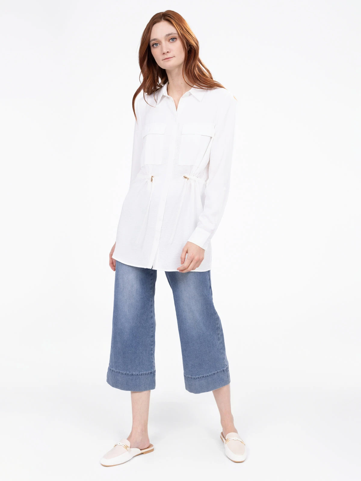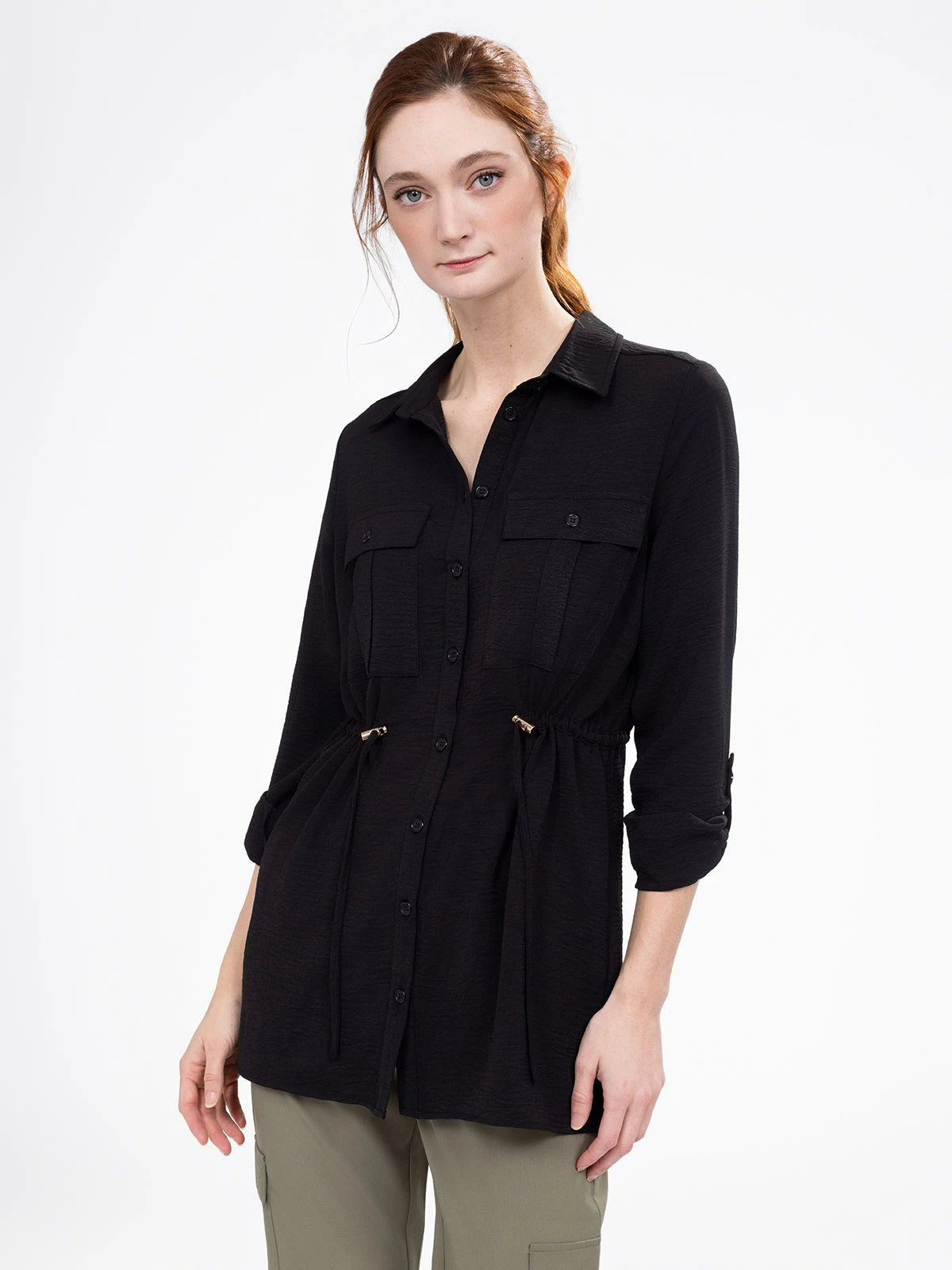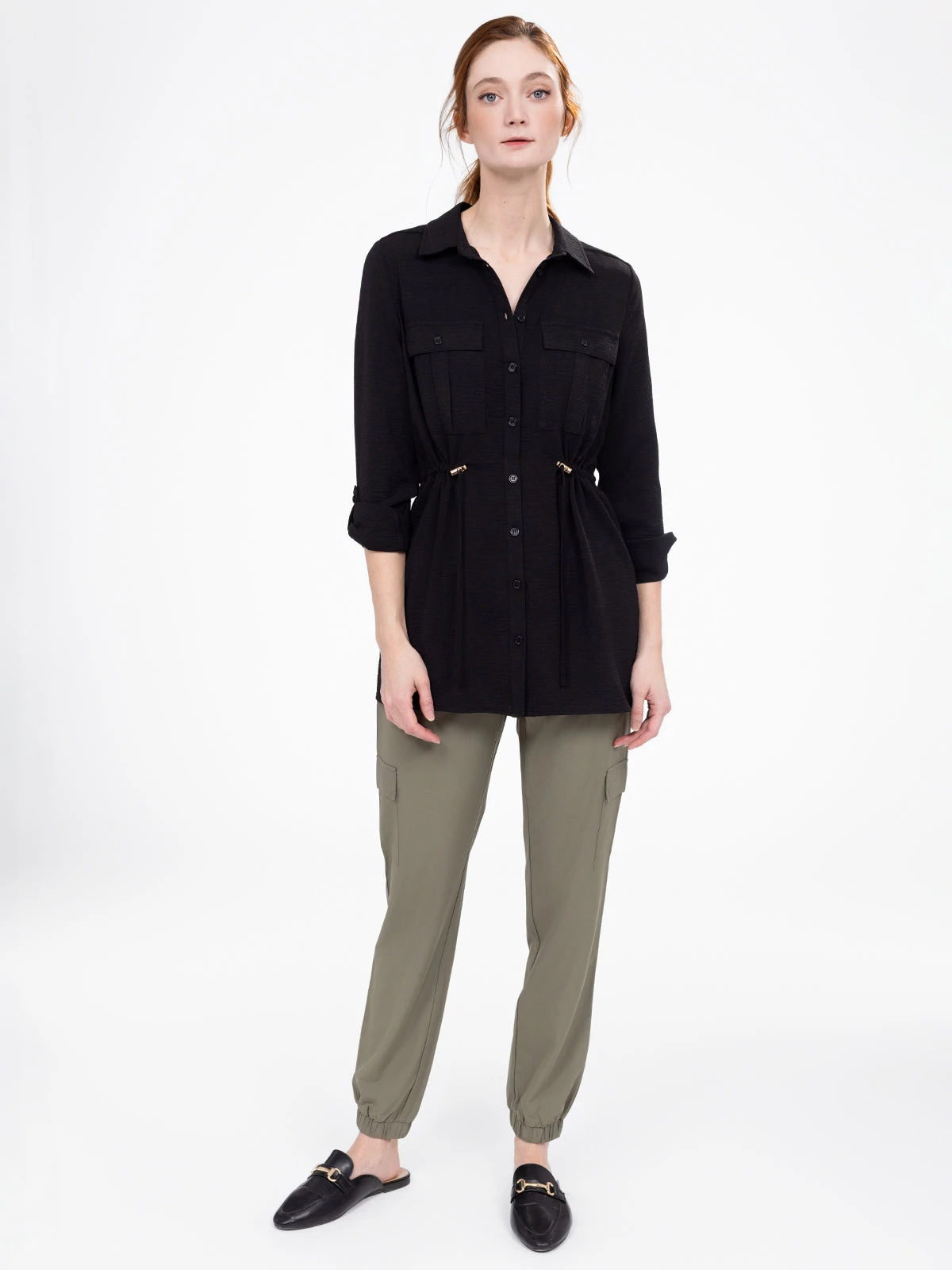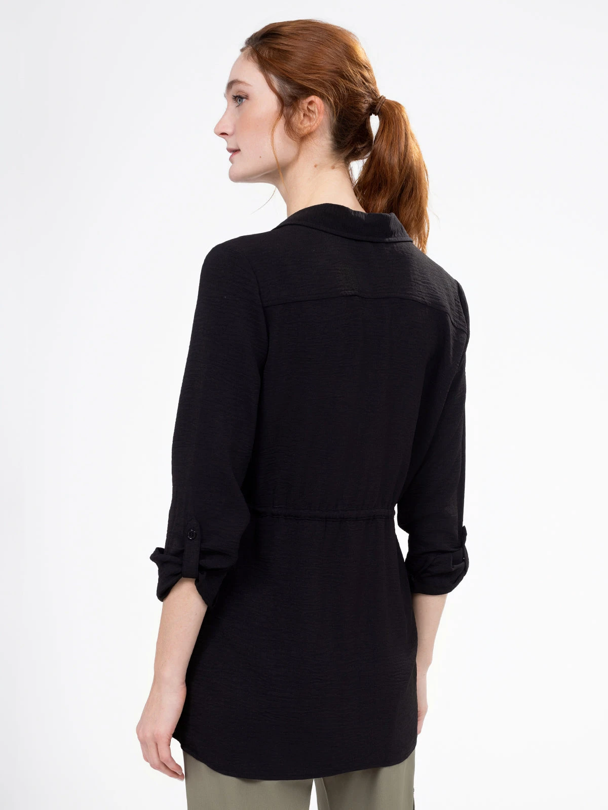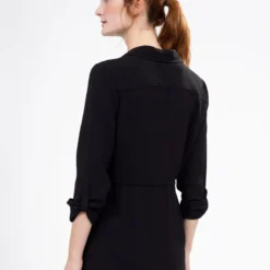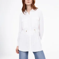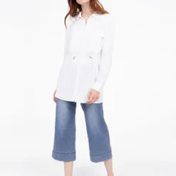 Une coupe longue et fluide pour une tunique qui joue sur les détails : boutons discrets, poignets boutonnés et taille cintrée pour une allure soignée.