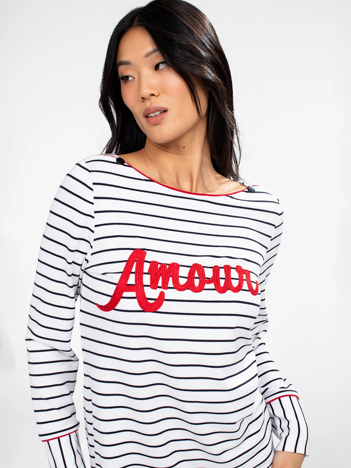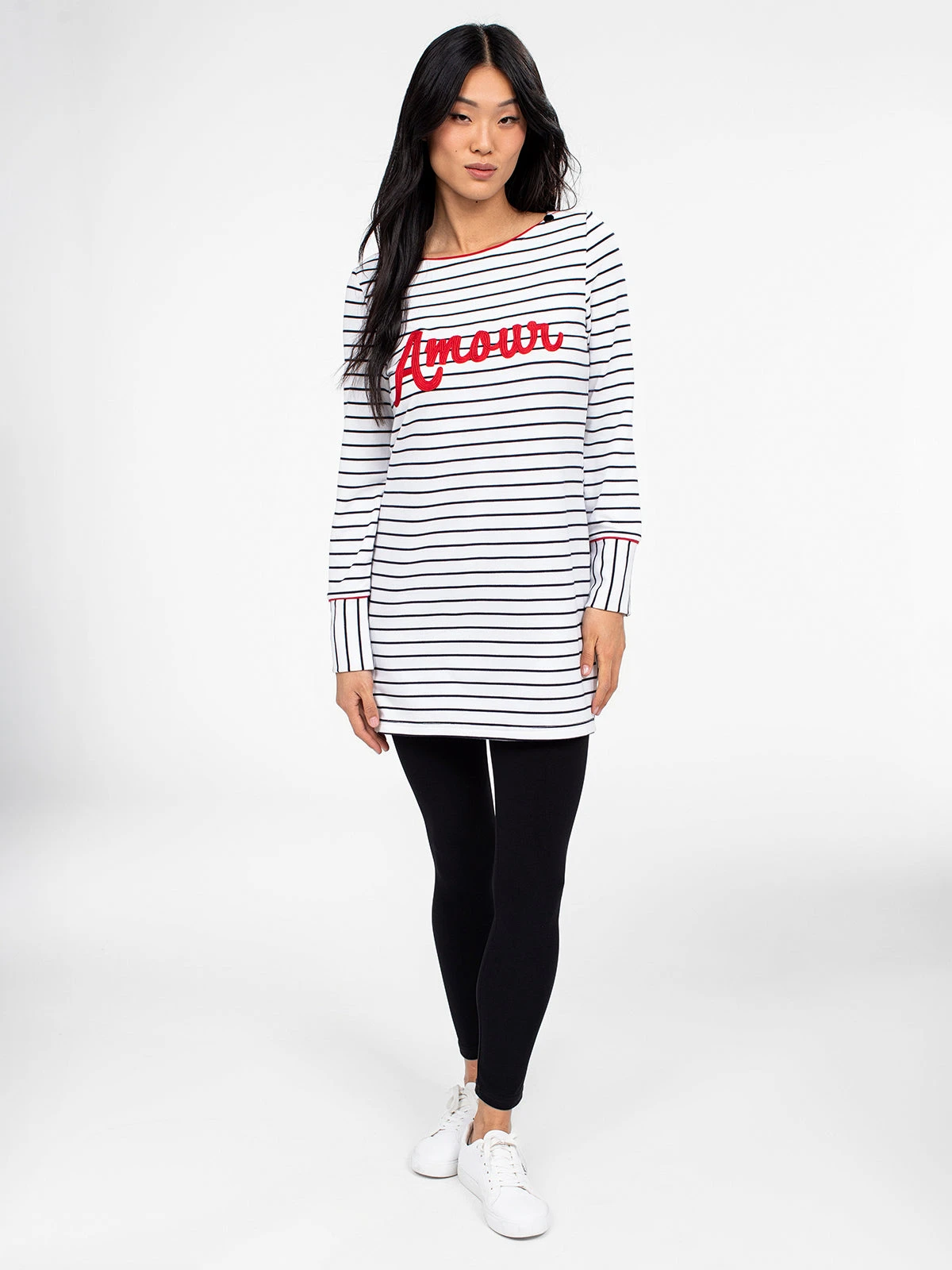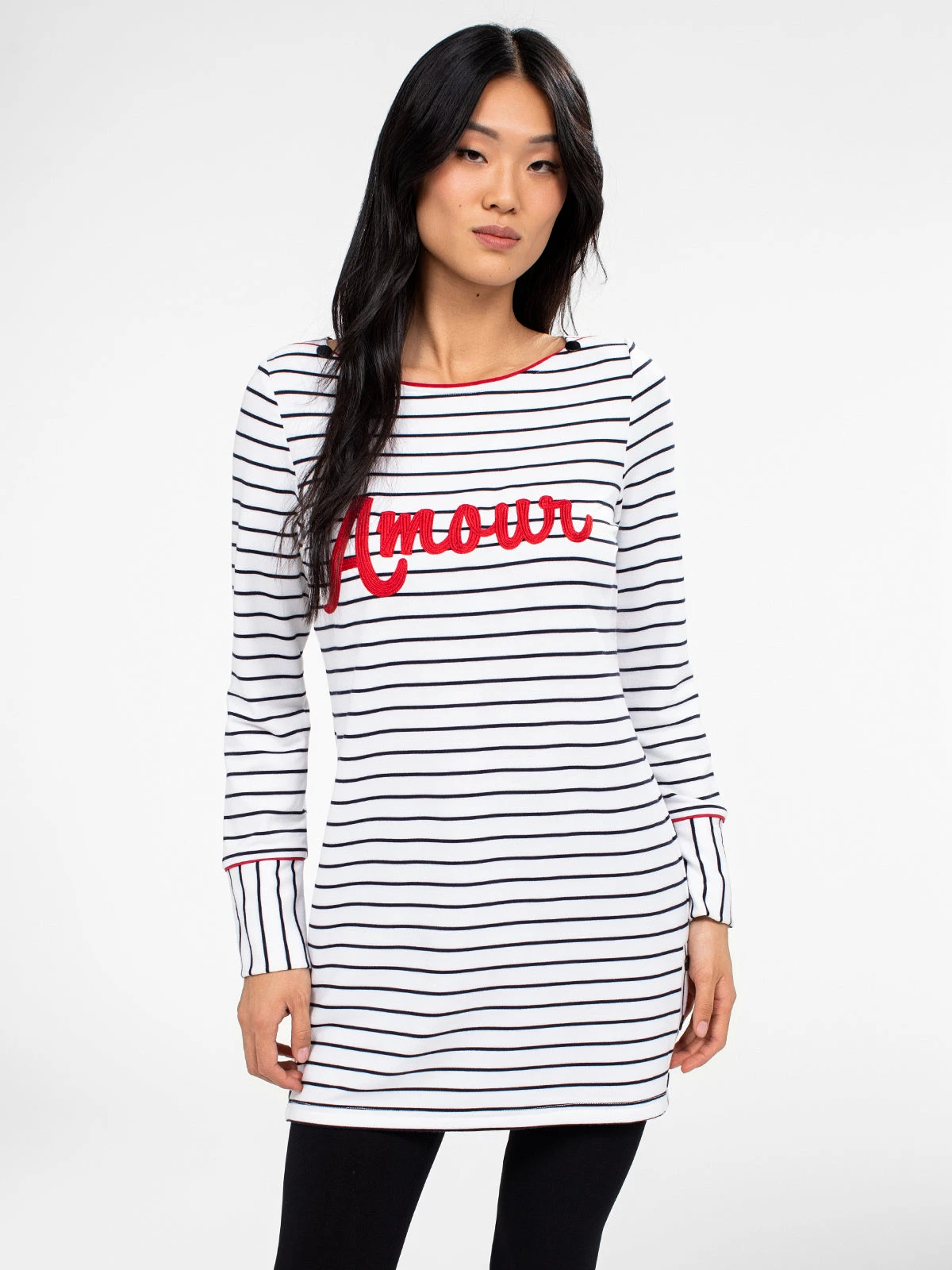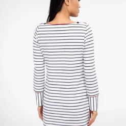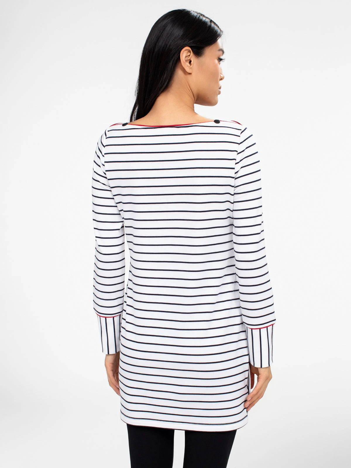 Cette tunique longue à rayures marines descend juste au-dessus des cuisses pour une coupe flatteuse. Les manches longues ornées de revers rouges et les boutons décoratifs sur les côtés ajoutent une note raffinée à son allure décontractée.