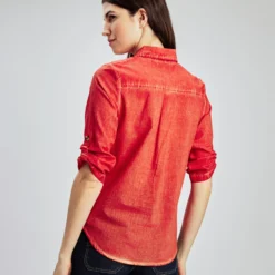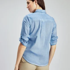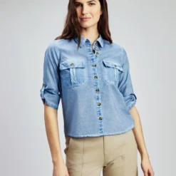 Cette tunique semi-ajustée est dotée de manches 3/4, de deux poches à rabat et est entièrement boutonnée.