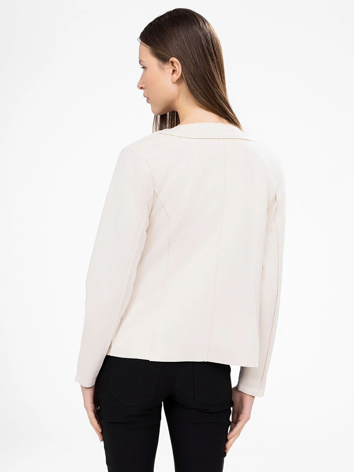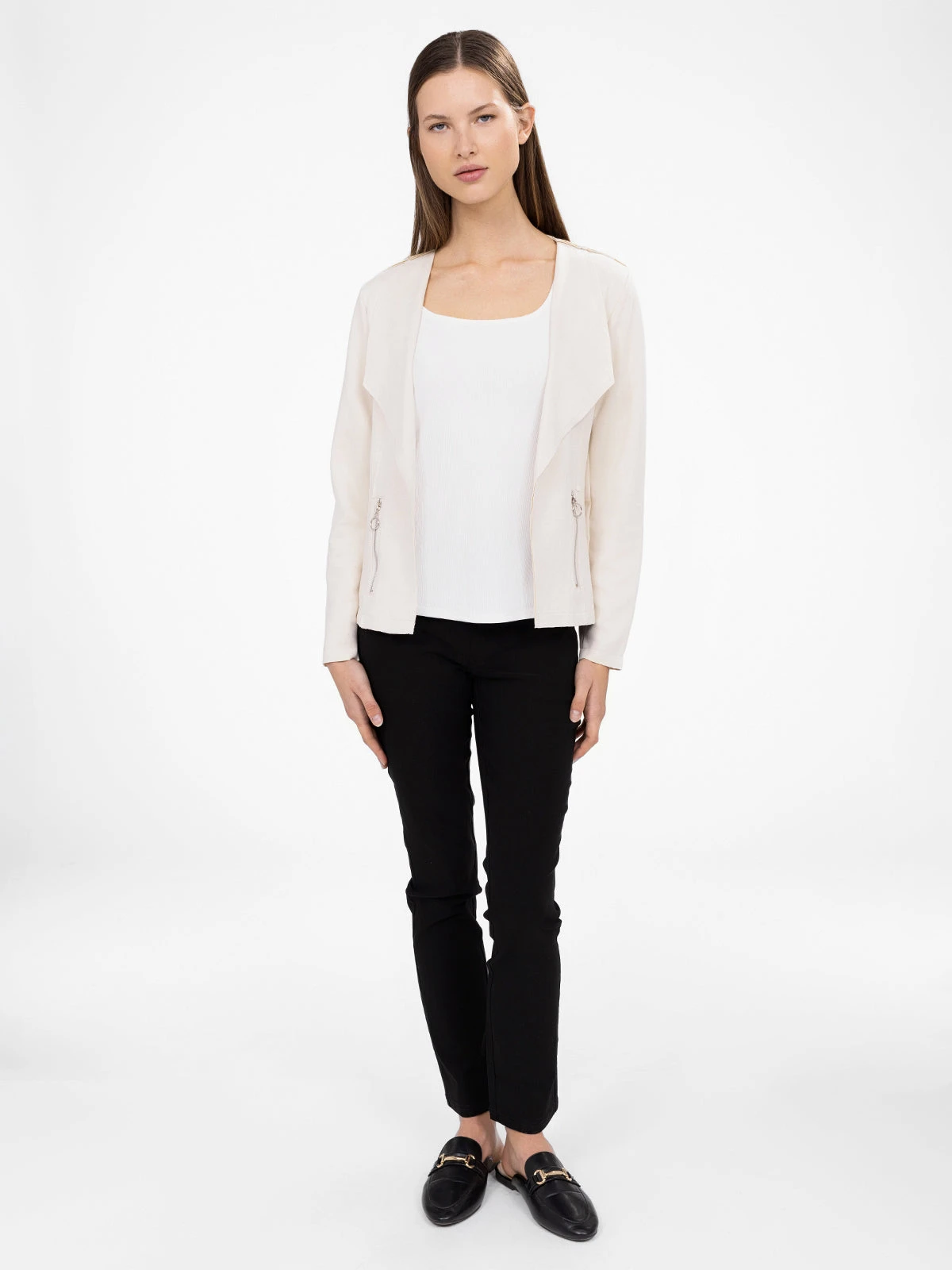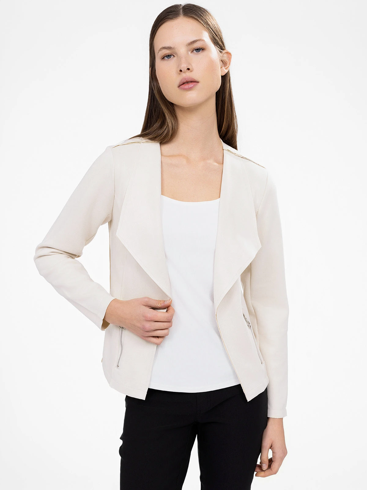 Cette veste revisite les codes du blazer avec une coupe fluide et une fermeture sans bouton. Une pièce minimaliste, rehaussée par des zips discrets pour une finition subtile.