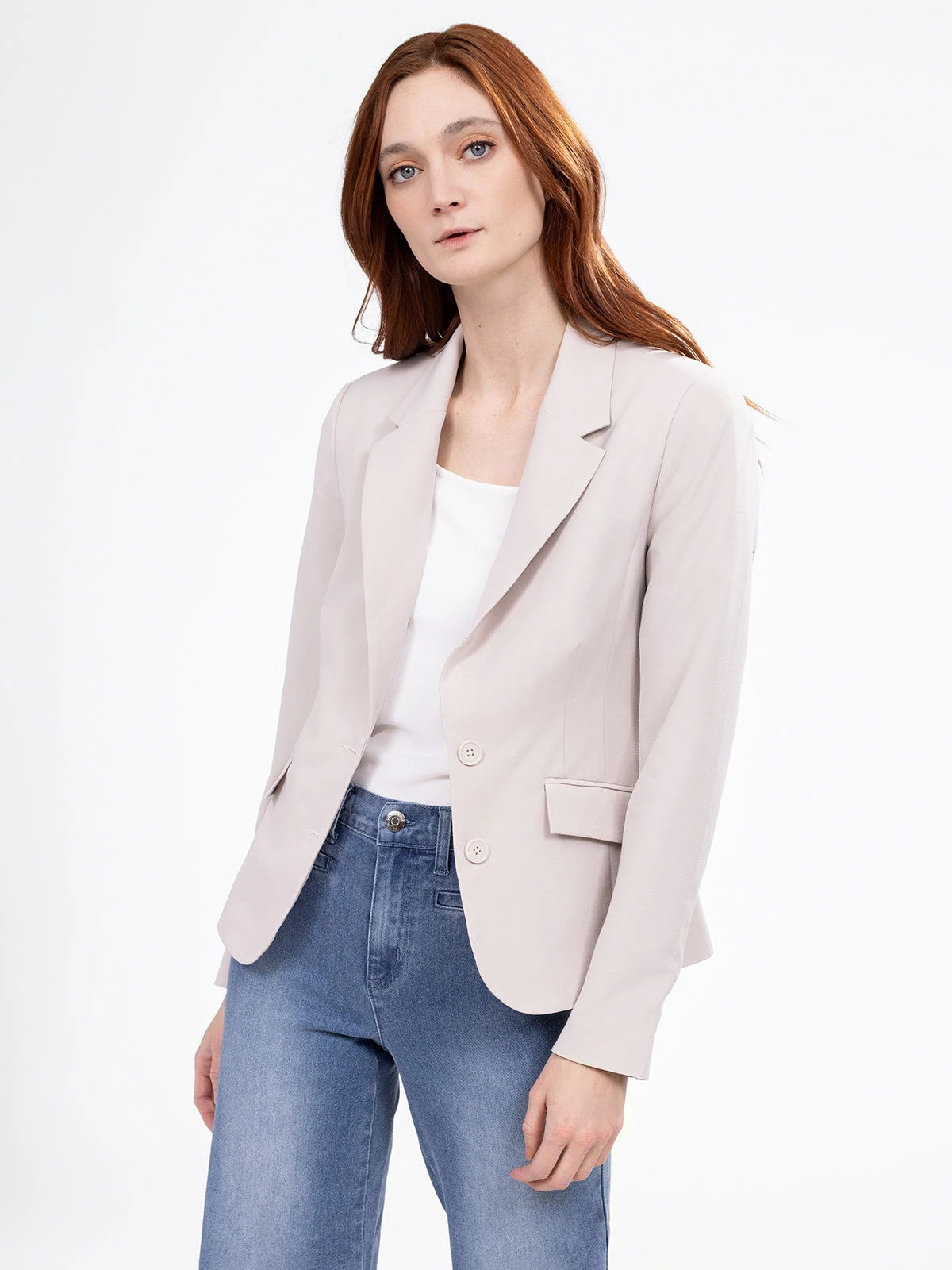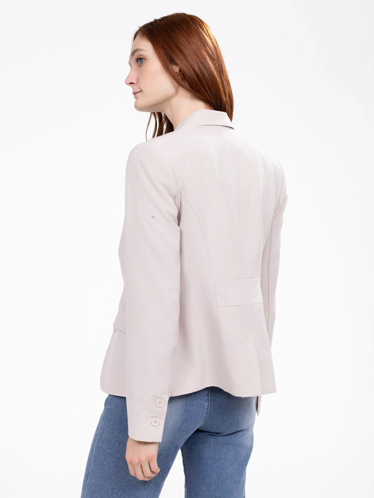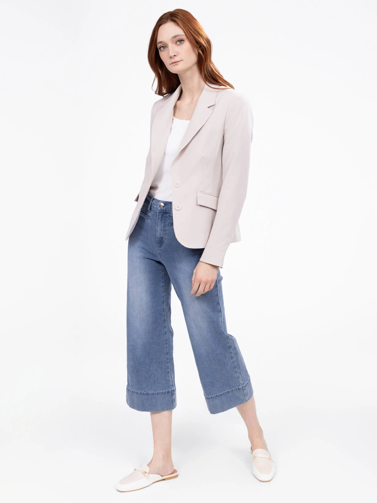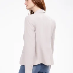 Ce veston minimaliste joue sur des lignes épurées et une coupe courte légÚrement cintrée. Ses poches passepoilées et ses finitions précises ajoutent une note soignée.
